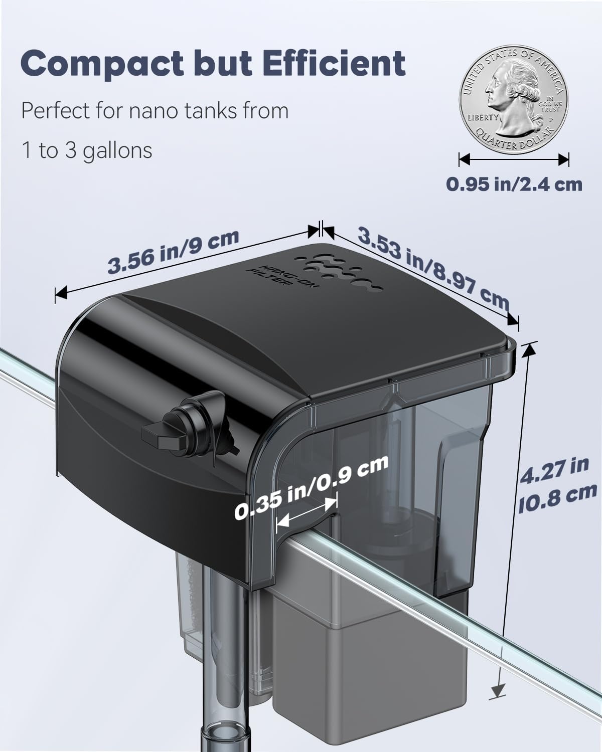 Compact but Efficient: Measuring just 3.53″ L x 3.56″ W x 4.27″ H, this aquarium filter fits perfectly in freshwater or saltwater tanks up to 5 gallons. It provides mechanical and biological filtration to keep your aquarium clean, stable, and healthy