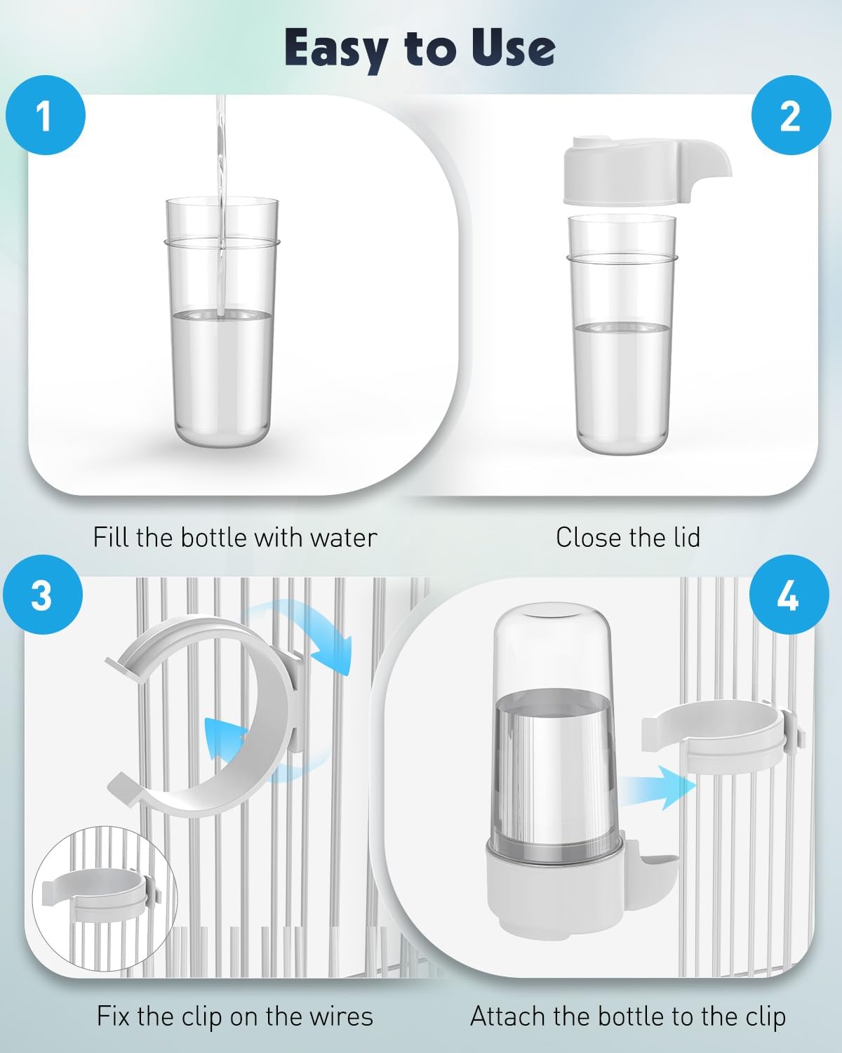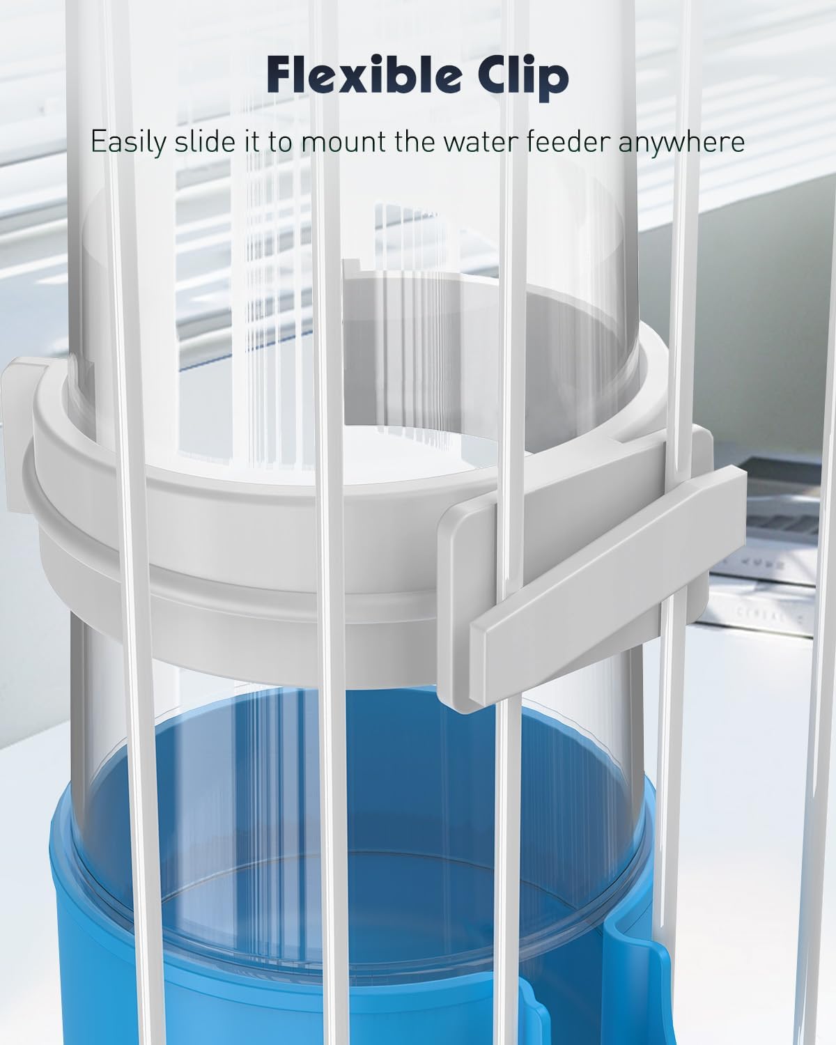 Automatic Water Feeding: Just fill the bird water dispenser with water and turn it upside down, and the water will flow automatically to the outlet. Ensure continuous water supply anytime. Never worry about your bird getting thirsty again