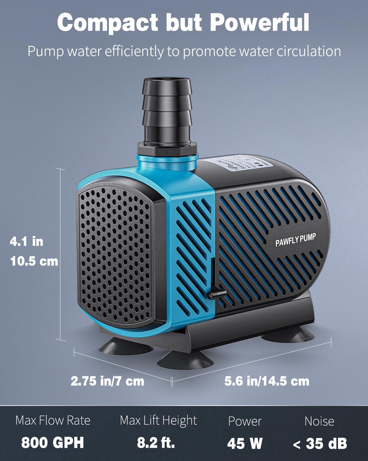 High Efficiency: Size: 5.6″ L x 2.75″ W x 4.1″ H; Max Flow Rate: 800 GPH; Power: 45 W; Max Lift Height: 8.2 ft. The submersible water pump brings efficient water circulation. Ideal for fish tanks, ponds, gardens, waterfalls, statuary or sumps.