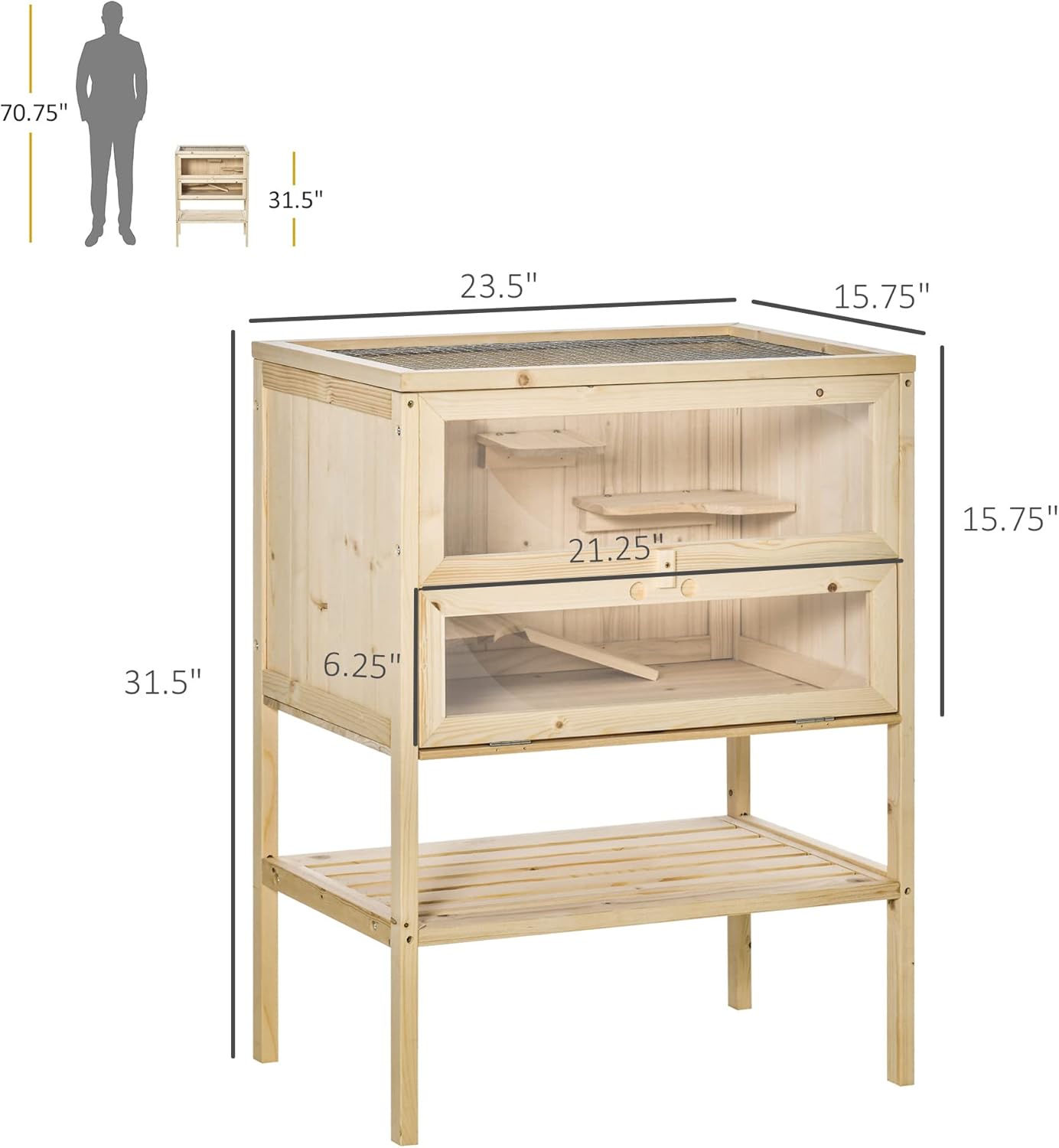 Create a safe space for your hamster to feel at home with this PawHut hamster cage. The modern design and quality fir wood make it a perfect home for hamsters to play and exercise. This extra tall, large wooden hamster cage is excellent for climbing. You can open the top for easier access to get your hamster out. The four legs are long enough to protect the gerbil enclosure from damp conditions. The bottom shelf can be extra storage for treats and paper bedding.