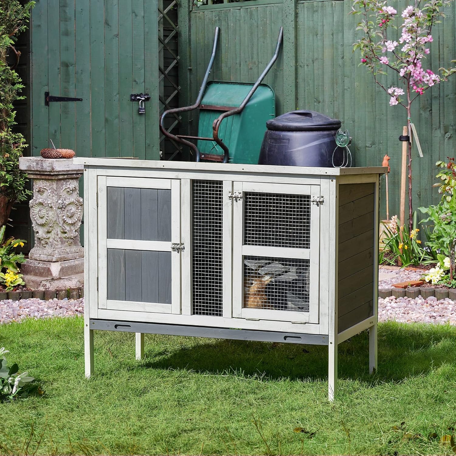 The rabbit hutch is suitable for rabbits, bunnies, guinea pigs, chinchilla, and other small animals Lockable doors to keep your pets secure and allow them to enter and exit easily The bunny hutch is made with a solid fir wood frame, a water-based paint and a tilt asphalt roof make this cage suitable for outdoor use Removable slide-out tray for easy and quick cleaning The roof on the bunny cage can be opened for easy cleaning and to provide air circulation The elevated design keeps the rabbit cage from getting wet Suitable for about 2 rabbits NOTE: Suitable for about 2 rabbits. Buyer to determine the amount of pets that will fit in the hutch depending on breed and size.