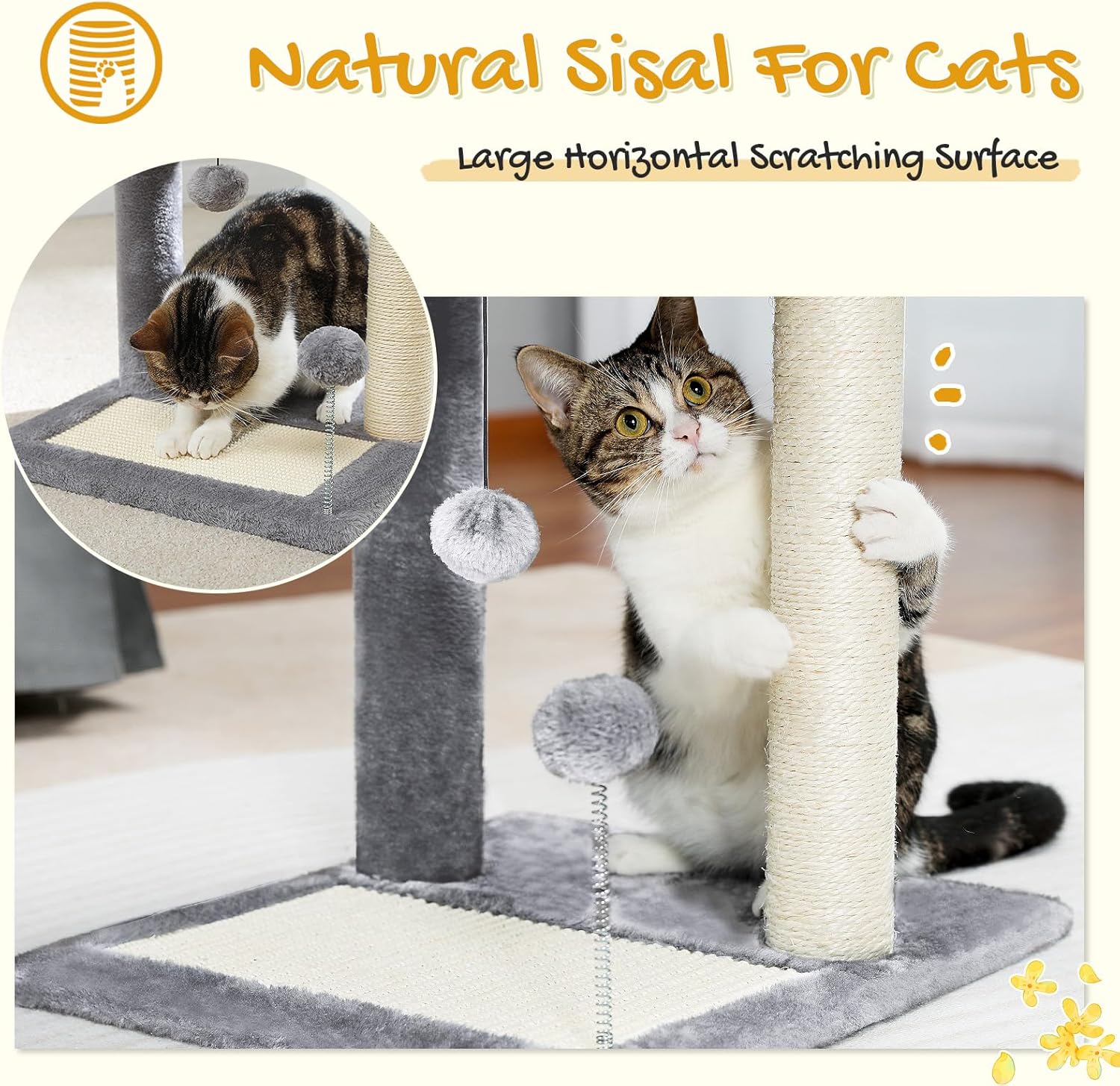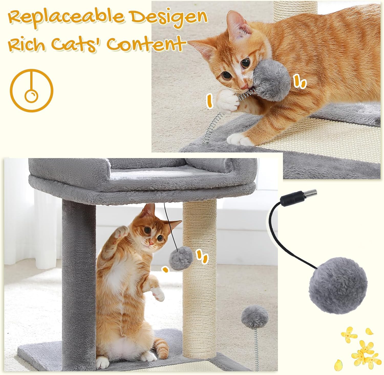 EXTRA FUN:This small cat scratching post tree bed is equipped with 2 fuzzy balls. A spring ball standing at bottom and a fluffy ball hanging from the top that add the thrill of hunt as bat it back and forth. Your cat will have hours and hours fun of it.