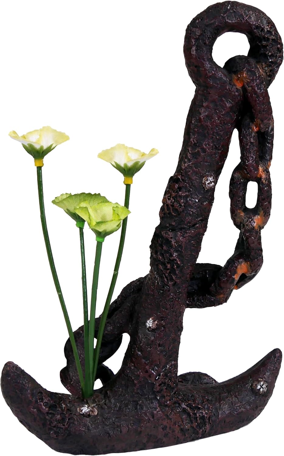I have a sunken ship theme for my aquarium, and I was really excited to add this to the decor. I received this today, and I am regretting not looking around more for an anchor. Not only is this one extremely boring (all one rusty color, which I should have paid more attention to the picture), it is quite ugly in person in my opinion, and it did not come with the flowers like it was supposed to. I will be looking into returning this.