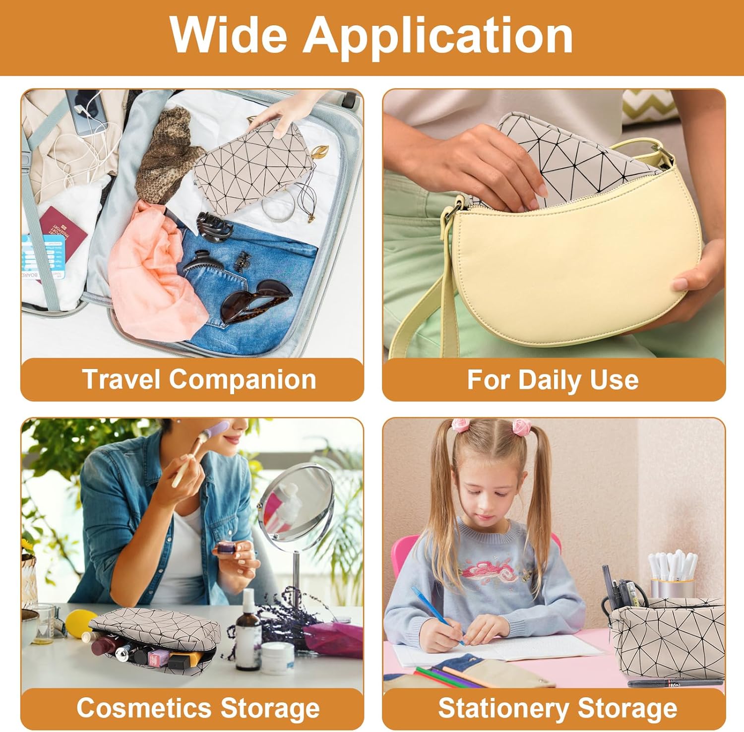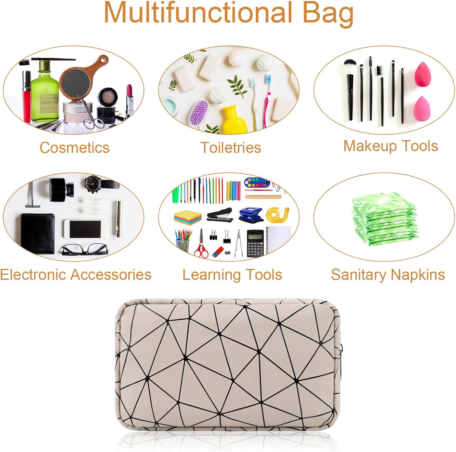 Purchased this bag because I needed a more discreet way to leave my desk and go to the ladies room. I love that it fits all the things I need on a daily basis and that time of the month. It’s stylish, it’s not too big or too small although I originally was looking for a slightly shorter more handheld bag but this has been working out quite fine.I would definitely recommend for girls & ladies in school too! It would fit in a backpack or a locker. It has enough space to fit other items.