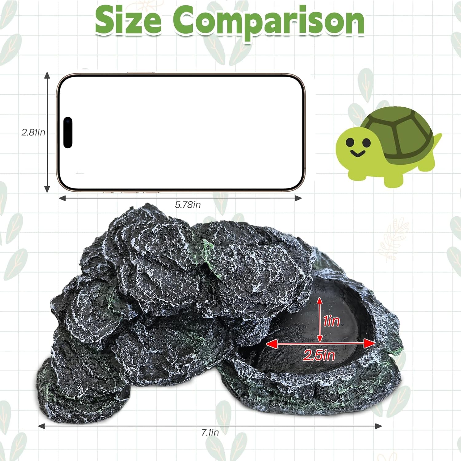 Multifunction Turtle Basking Platform: The reptile hide measures 7.1 x 4.7 x 2.7 inches, and provides a safe and comfortable area for small-size aquatic turtles, snakes, crested geckos, lizards, frogs, and newts to bask and relax