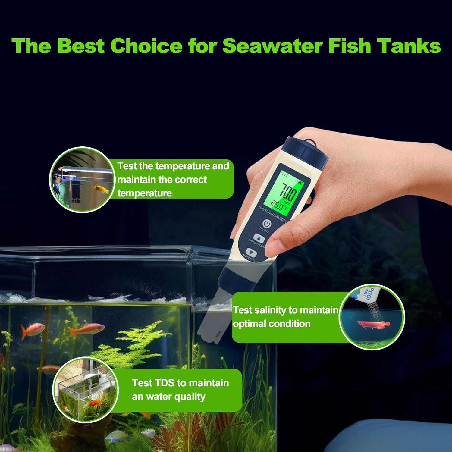 The 5-in-1 water quality tester can measure PH/TDS/EC/SALT/TEMP