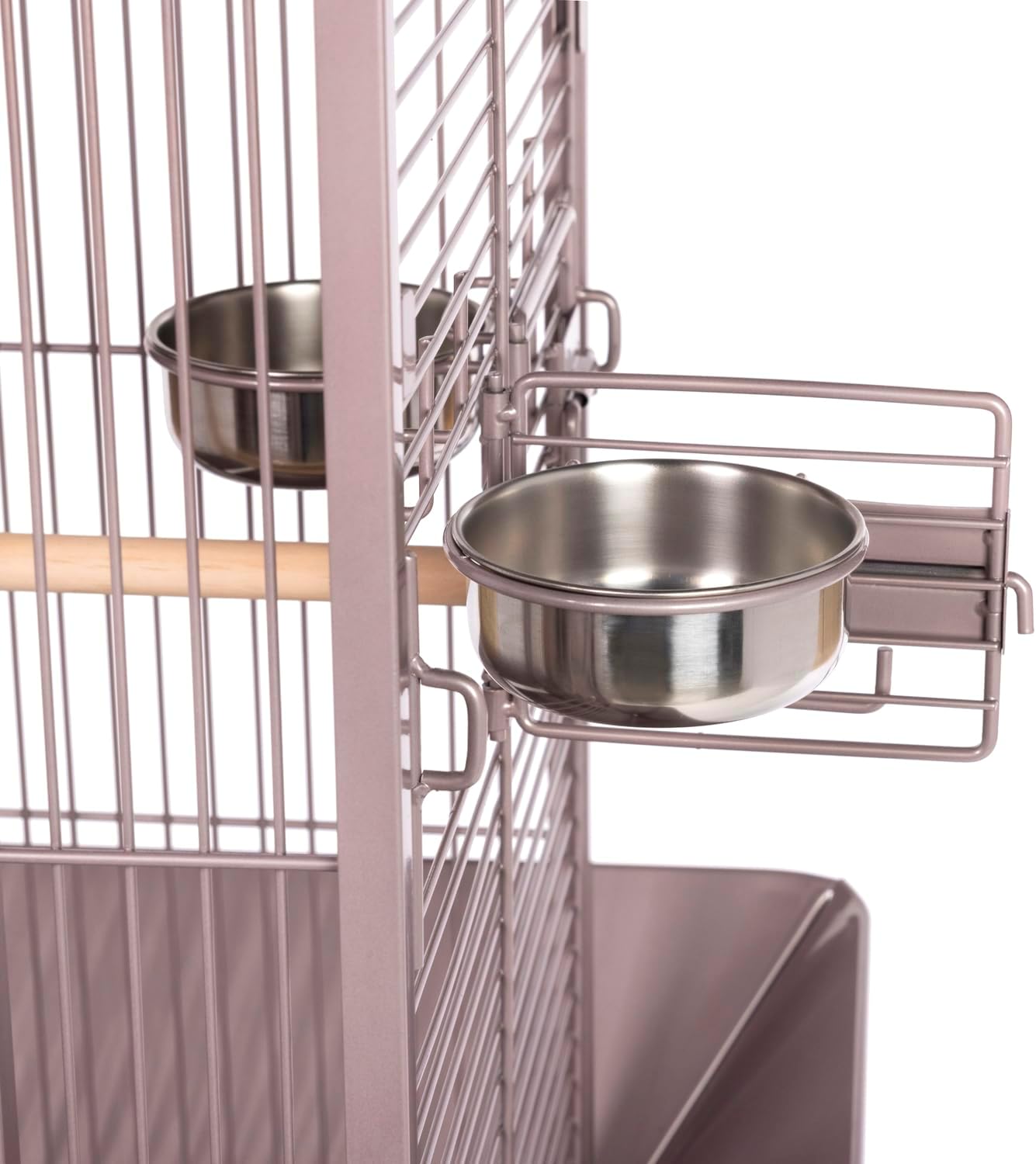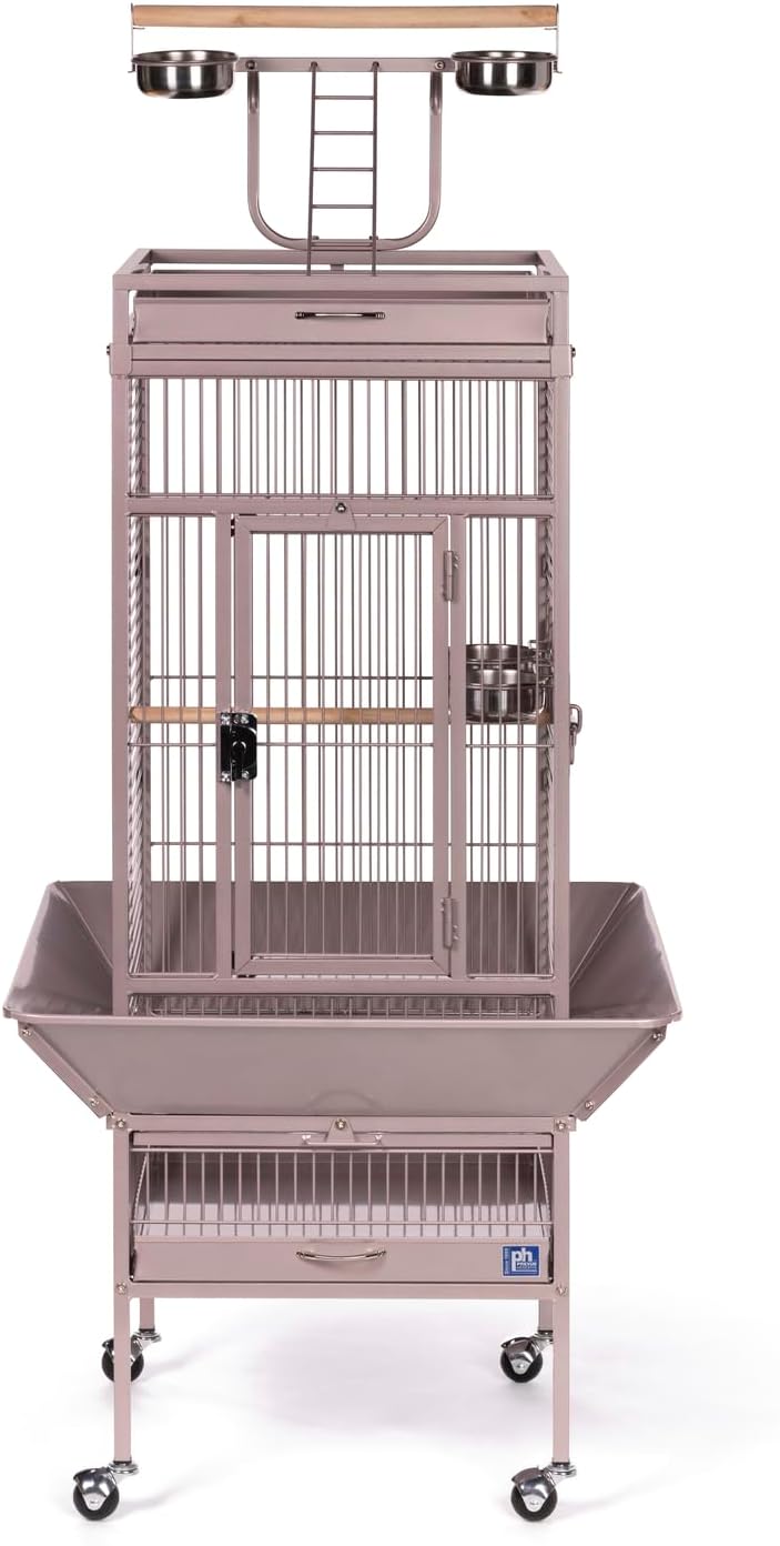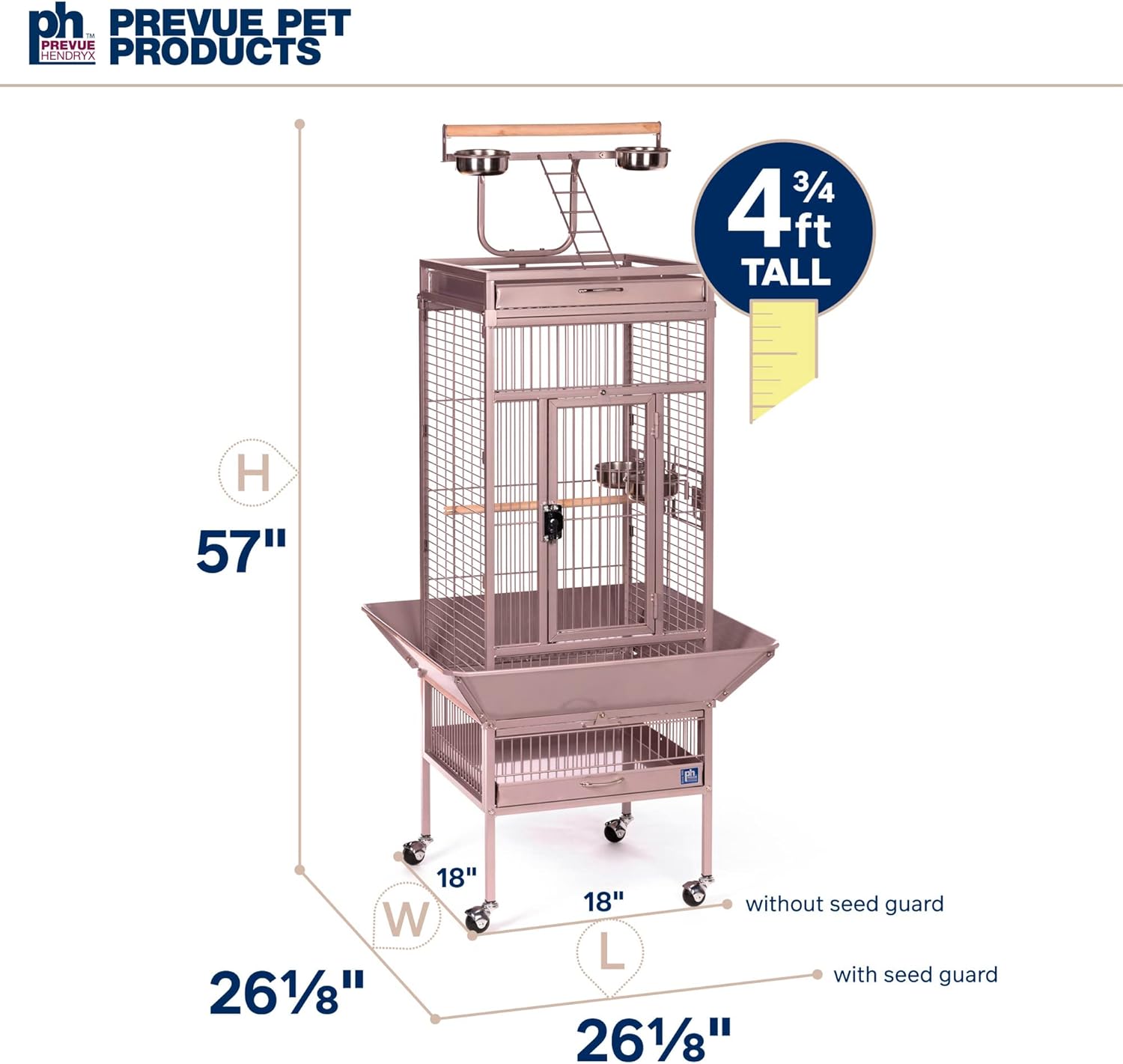 Prevue Pet Products powder-coated steel construction 3151BLUSH offers quality craftsmanship at an affordable cost. Pet-safe, powder-coated steel construction with a cagetop playstand to keep your bird entertained and content, the easy slide lock can be operated with one hand, while keeping your bird securely inside its cage when playtime is over. This select bird cage also includes four stainless steel cups, two wood perches and a caster stand for portability. Both trays and bottom grille are removable for ease of cleaning while the rounded corner seed guards control mess around the cage. Measures 18″ long, 18″ wide, 57″ high with 3/4″ wire spacing. With seed guards, measures 26 1/8″ L x 26 1/8″ wide.