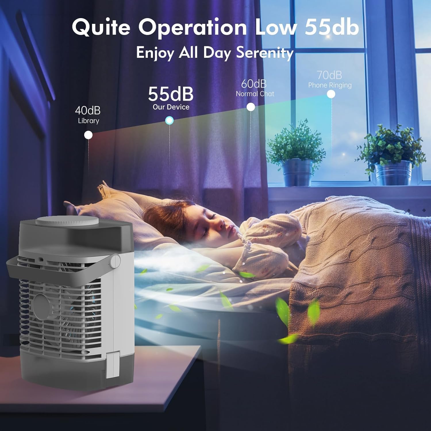 【Low-Noise Operation & Mood Lighting】This mini desk fan with built-in humidifier runs at just 55 dB, letting you sleep soundly or focus on work undisturbed. It features 7 soothing night light colors to match your mood.