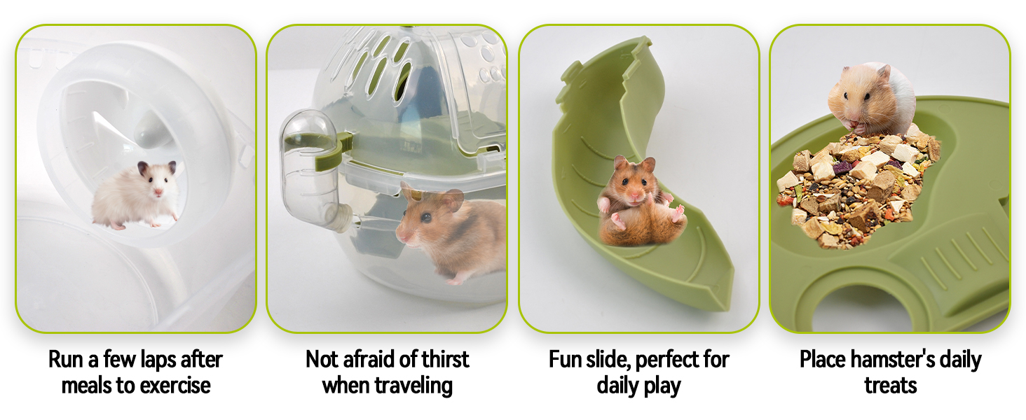 4 IN 1 Hampster Cage:Hamster carrier with water bottle,food bowl,hamster wheel,hide with slide. Syrian hamster travel cage is a cage to eat,drink,live,play,sport.Rat carrier cage is a perfect hamster accessories as temporary shelter