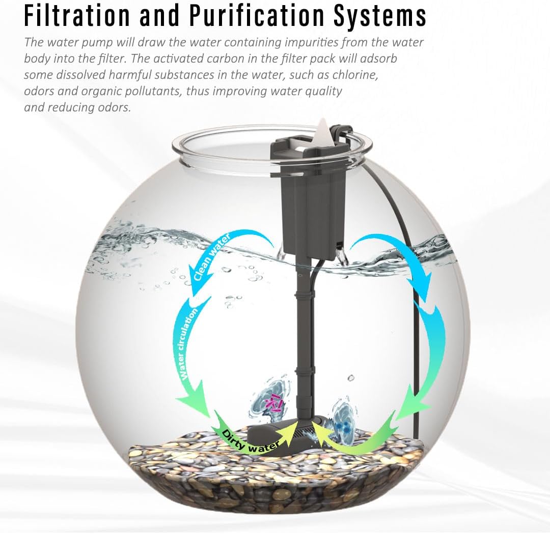 POWERFUL & ADJUSTABLE FILTRATION – The low-power 3W filter pump delivers an adjustable 25-50 GPH flow rate, allowing you to customize water circulation based on your tank size. Combined with the advanced filtration cartridges, this system effectively removes impurities, debris, and harmful substances, keeping water crystal clear.