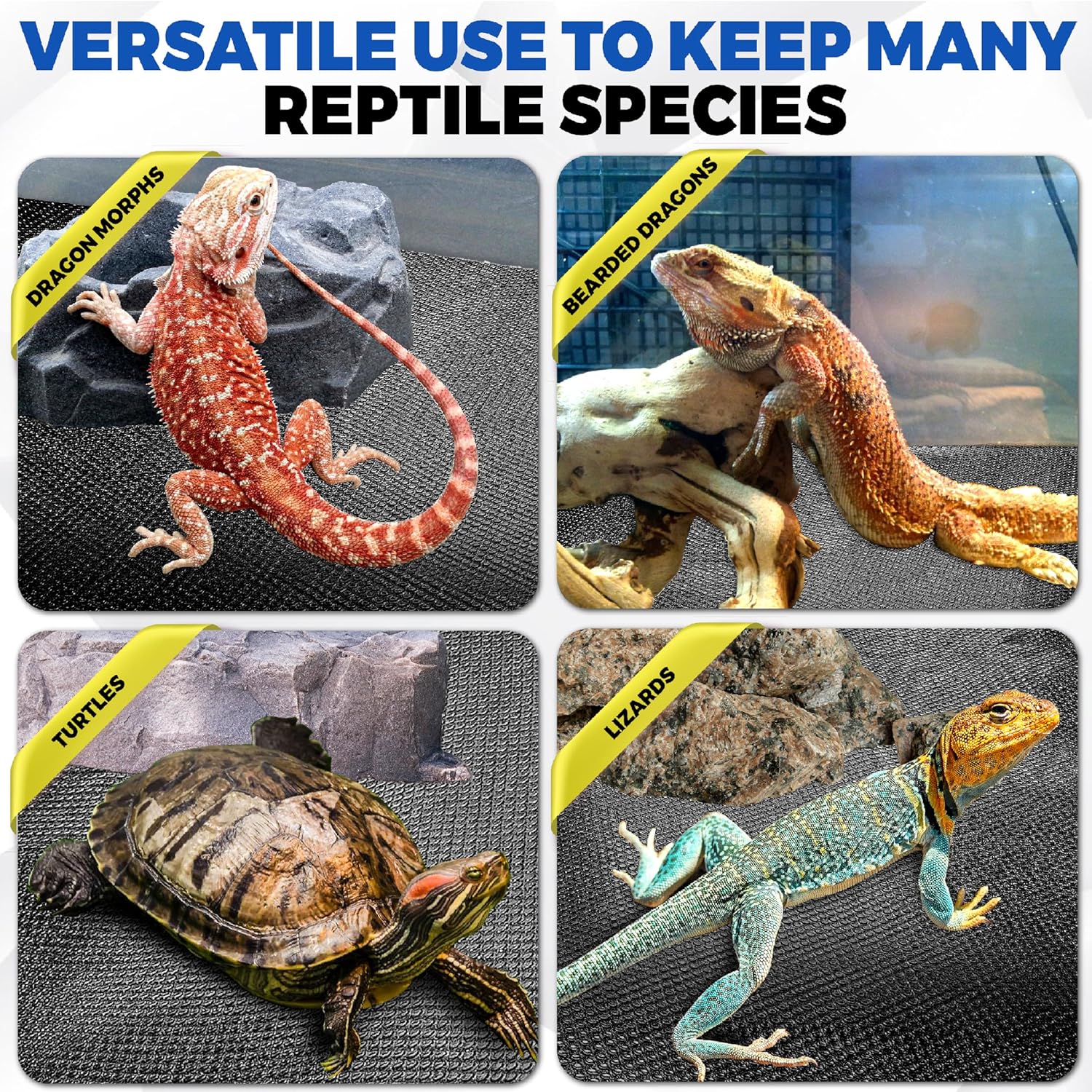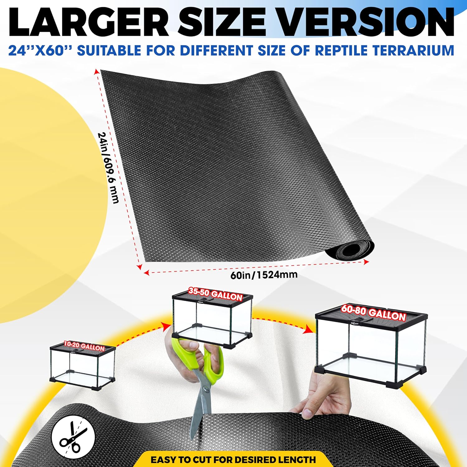 [Easy Adjustable Desired Length] We provide an ideal 24 inches-wide and 60 inches-long mat. It can be easily cut to the desired length with common scissors to fit most tank sizes, even large tanks. Besides, we provide 4 PCS reusable rug grippers to hold 4 carpet corners in place. This versatility allows you to create a seamless and consistent environment, ensuring the mat fits and looks great in your reptile’s habitat.