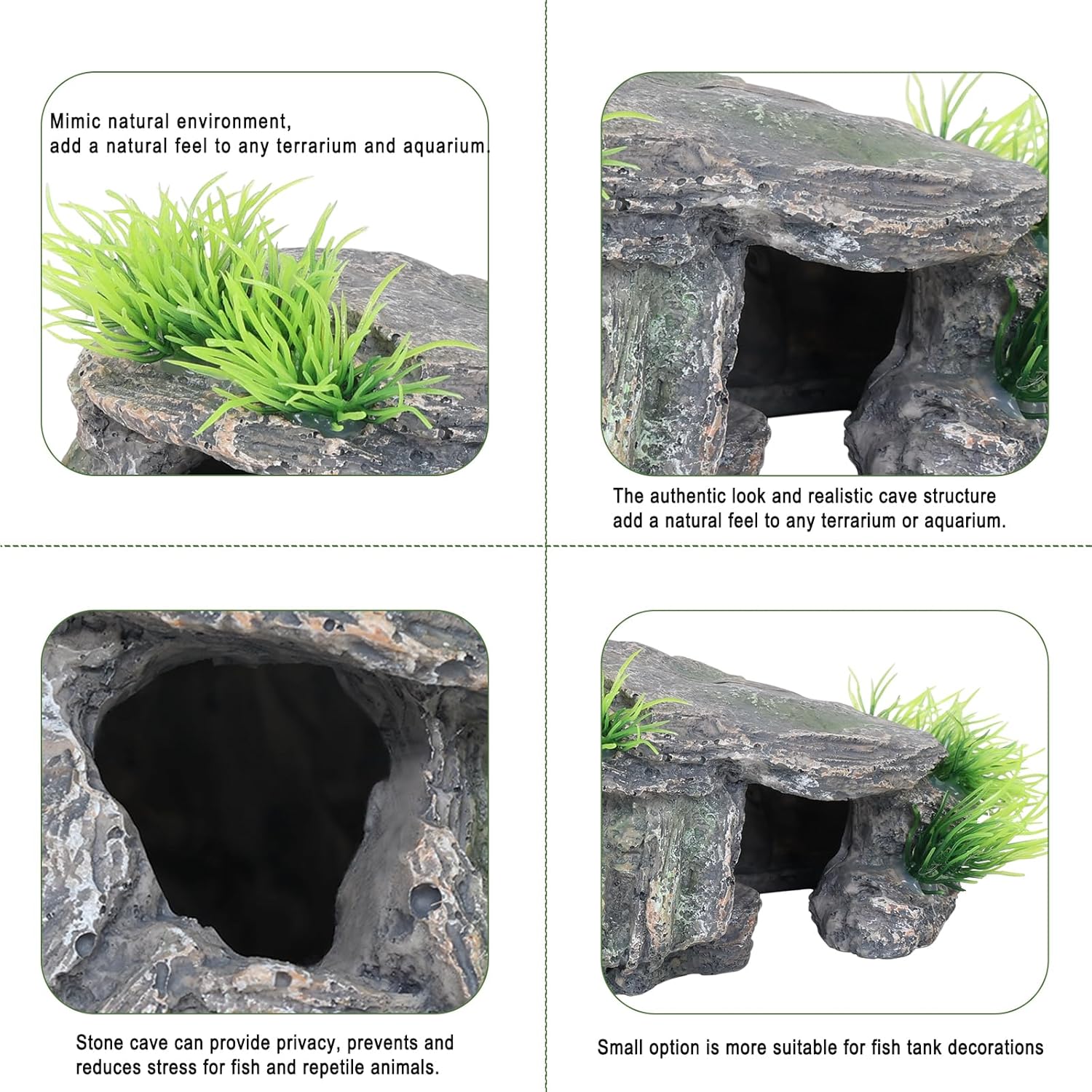 The aquarium cave has two openings allow fish swim in and out. At some time slate ledge is perfect for reptiles hide or climbing and basking.