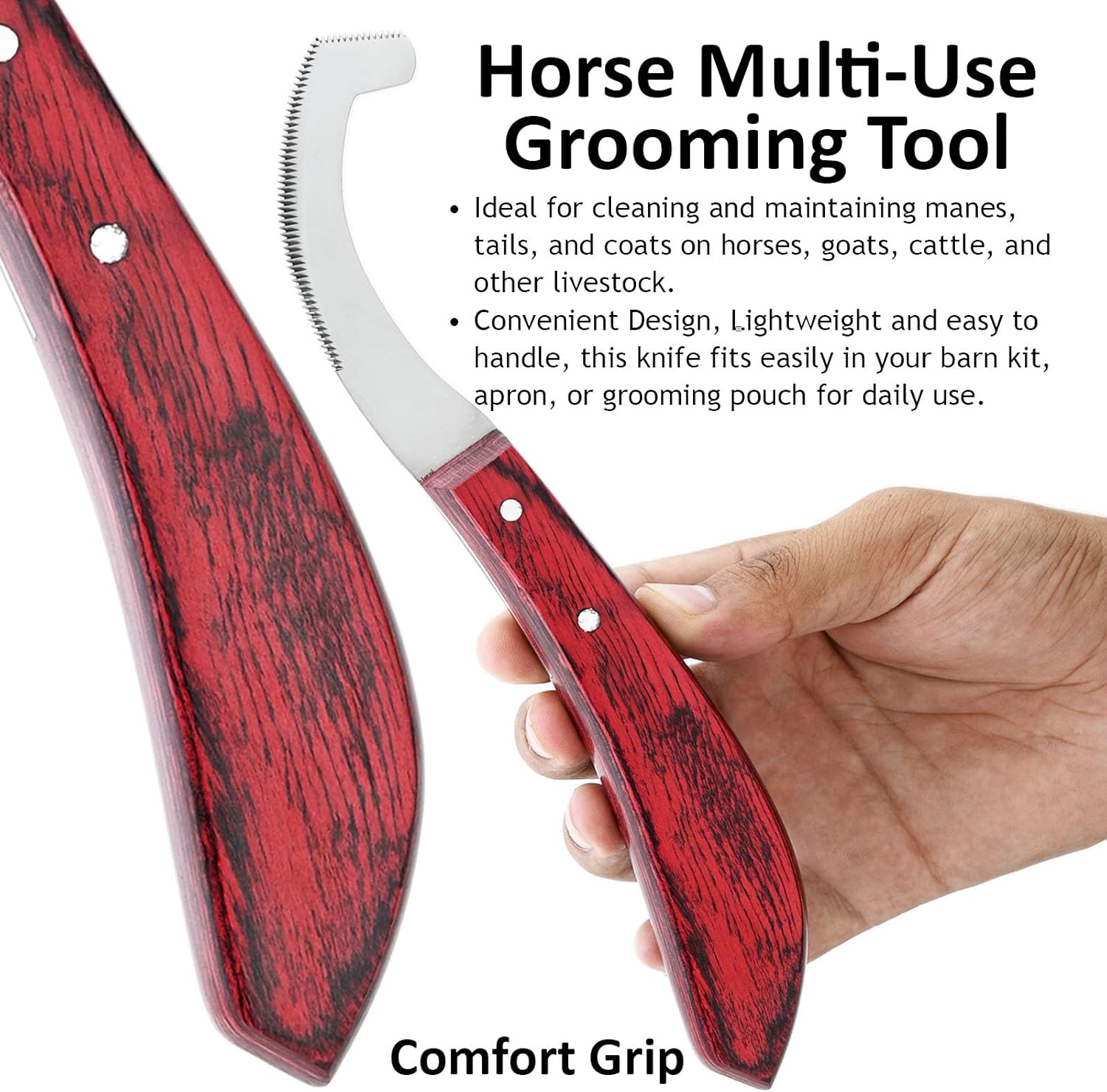 Pro Farrier Grooming Bugs Bot Knife– Stainless Steel Blade, Wooden Handle, Multi-Purpose Mane and Coat Cleaning Tool for Horses, Goats, and Cattle (Red)
