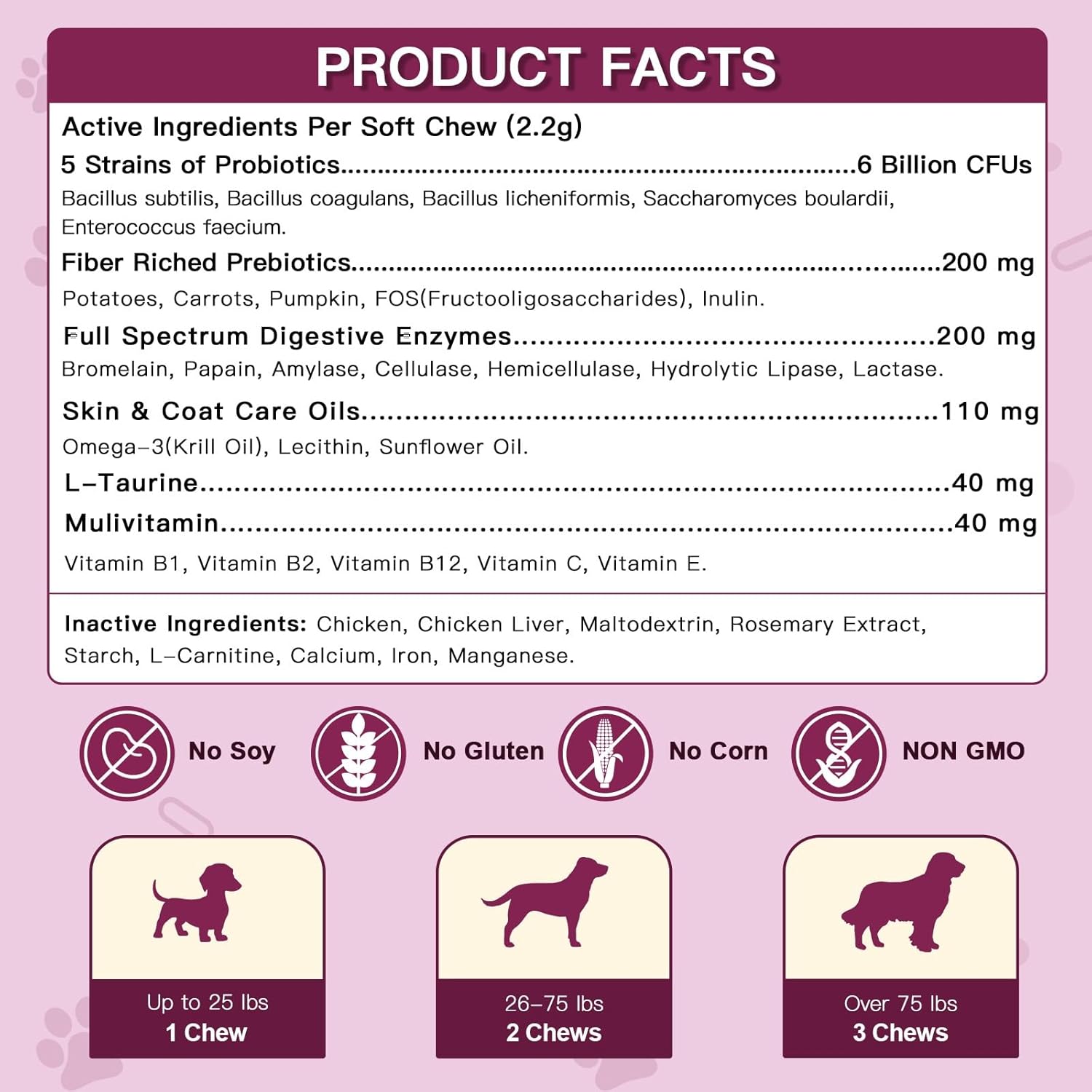 Easy to Chew for All Breeds and Ages: Our probióticos para perros is a tasty chicken flavor chewy treats that your dog will love. Unlike hard-to-swallow pill, you dont have to hide our dog gut health probiotics in the food