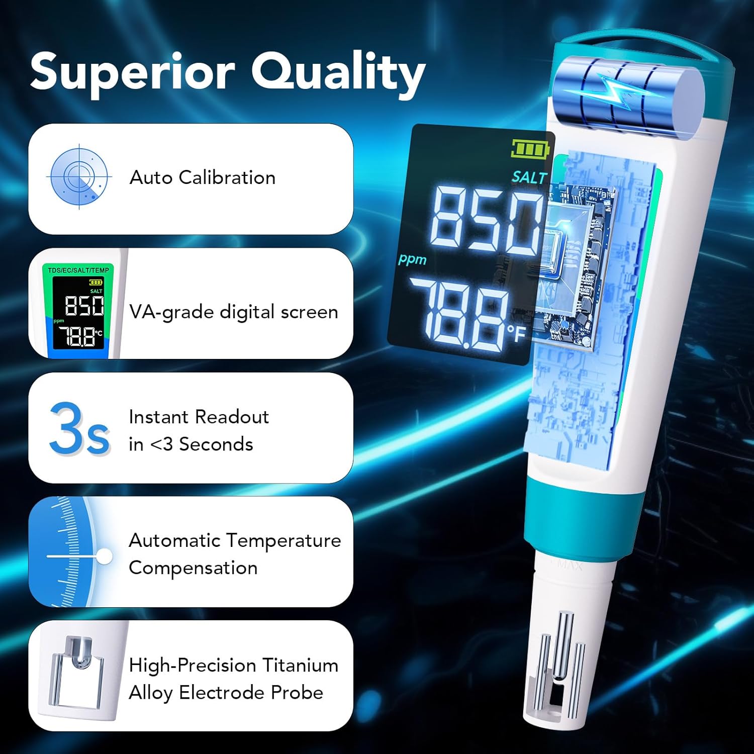 4-in-1 Water Quality Monitor with Focus on Salt : More than just a salinity tester, this digital water quality meter also measures TDS (Total Dissolved Solids), EC (Electrical Conductivity), and Temperature, giving you a full picture of your pool’s condition in one smart device.
