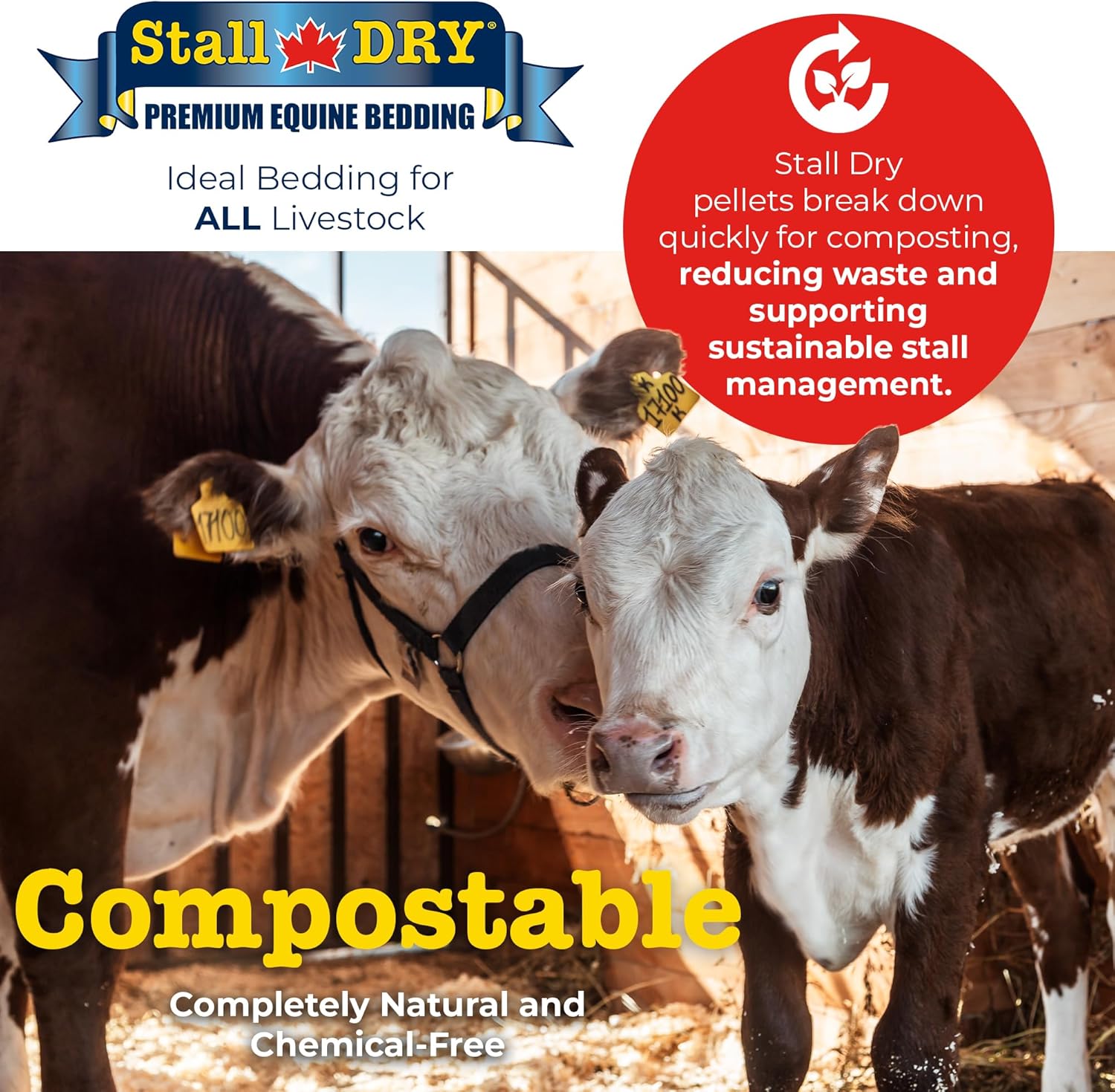Stall Dry Premium Equine Bedding Pellets offer superior moisture absorption, odor control, and sustainability for stalls, barns, and animal enclosures. Made from 100% reclaimed wood and kiln-dried for maximum absorption, these pellets expand when they come into contact with moisture, ensuring a dry, comfortable, and hygienic environment for your horses and pets. With natural pine deodorizing properties, Stall Dry Pellets effectively neutralize odors and ammonia buildup, improving air quality and creating a healthier space for animals. Unlike traditional bedding, these biodegradable and compostable pellets break down quickly, reducing waste and promoting eco-friendly stall management. Ideal for horses, livestock, small animals, and poultry, Stall Dry Pellets provide a safe, dust-free, and chemical-free bedding solution without synthetic perfumes or additives. Perfect for use in stables, barns, vet clinics, pet shelters, and more, to keep stalls fresh and clean.