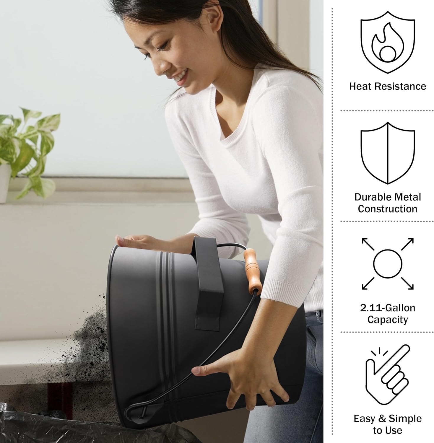 HEAT RESISTANCE – Featuring a heat-resistant wooden grip handle, the ash bucket for fireplace protects your hands from burns while the thermal insulated bottom and 2 vents prevent the bucket from heating up, protecting your floors from heat damage.