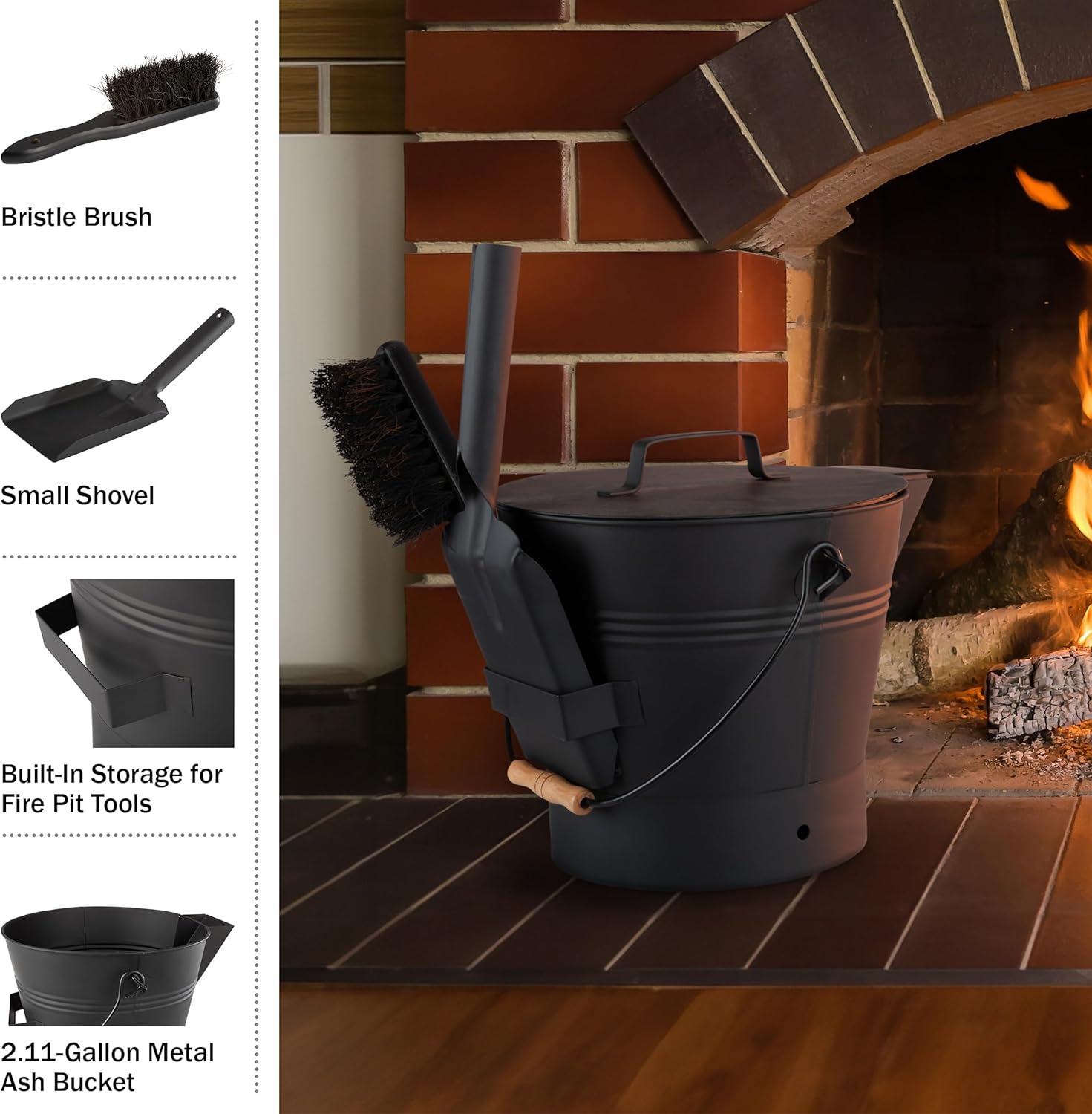 FIREPLACE ASH BUCKET – This fireplace set comes with a metal ash bucket with lid, a bristle brush, and small shovel with wood handles, perfect for disposing of ashes from your wood stove, fireplace, firepit, and pellet stove.