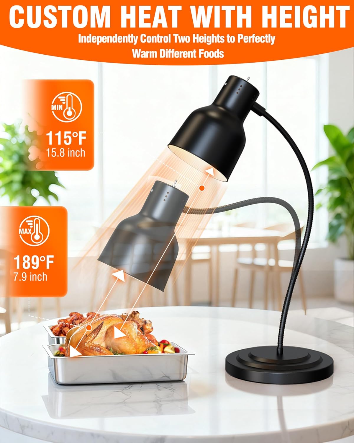 BUILT FOR MULTI‑DISH WARMING: From busy restaurants and buffets to mobile booths and wedding setups, this food heat lamp adapts effortlessly to your needs for different kinds of food warming. Its sleek design fits seamlessly into professional or decorative settings, while the adjustable lamp head allows precise heat control across various trays and dishes