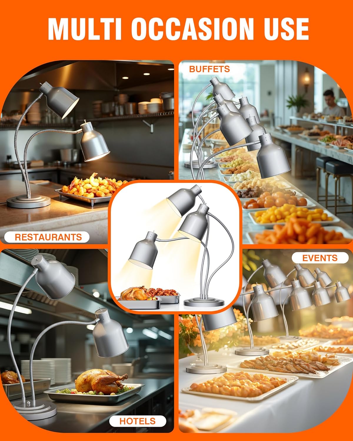 360° HEAT CONTROL: This commercial heat lamp food warmer features gooseneck arms that pivot 360° for precise heat placement. Adjust each food warmer lamp head for various dish sizes and layouts, minimizing cold spots and delays in high‑volume kitchens like buffets, steakhouses, or hotel breakfast lines