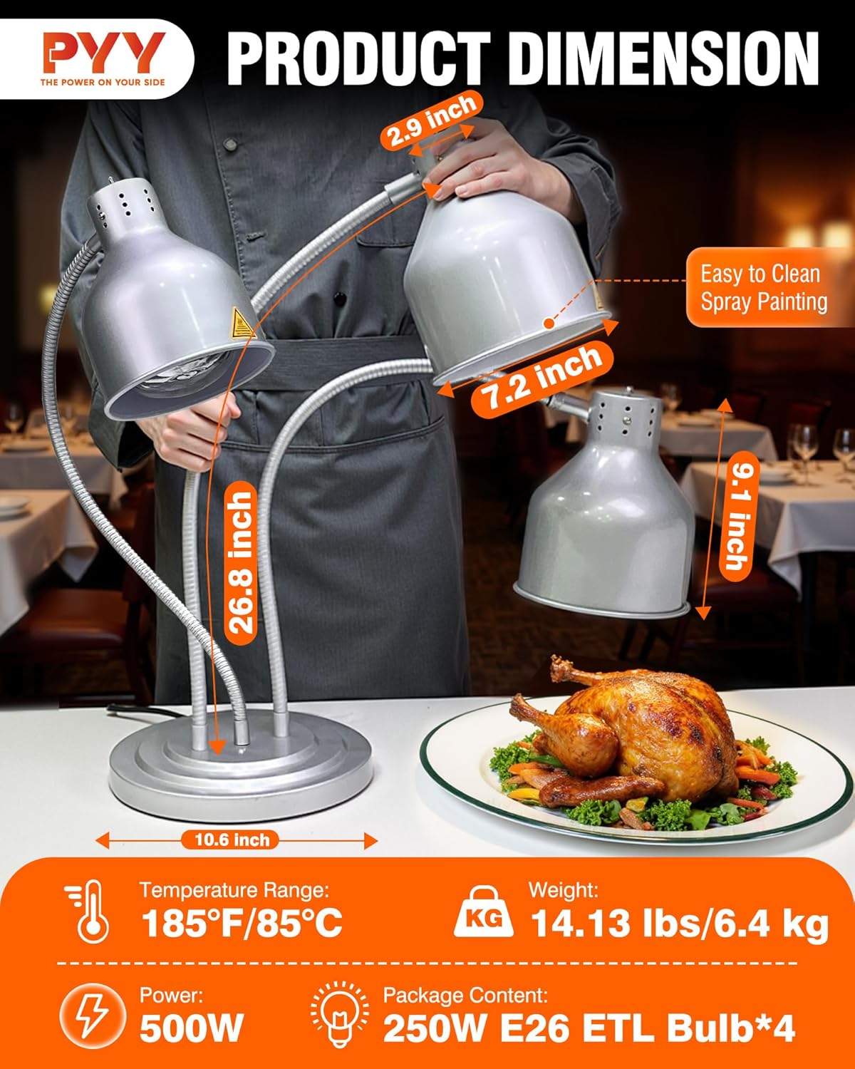 3 reviews for PYY Food Heat Lamp – 750W Steady Heating Commercial Food Warmer Lamp, 3 Bulbs Included, Heavy Base for Stability & Stainless Steel Build, 17.3 lbs Ideal for Catering, Restaurant, Buffet, (3-Head)