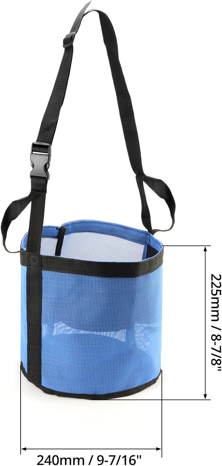 Product Name Horse Feed Bag Material 600D Waterproof Oxford fabric Diameter 9.5″ Height 9″ Color Blue Let the Horse Eat Merrily No one likes to fight over food Reducing Food Waste The bag has a no-waste lip that catches the grain