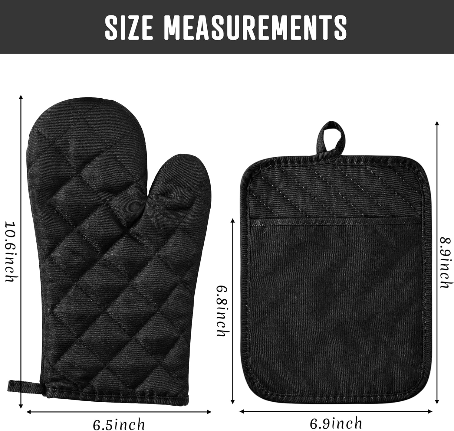 Pot Holders Oven Mitts Sets – The package includes 2pcs black BBQ oven mittens (6.5 x 10.6 inches) and 2pcs black cotton potholders with pocket (6.9 x 8.9 inches). Totally 4 pieces, easily meet your cooking and baking needs in daily life.