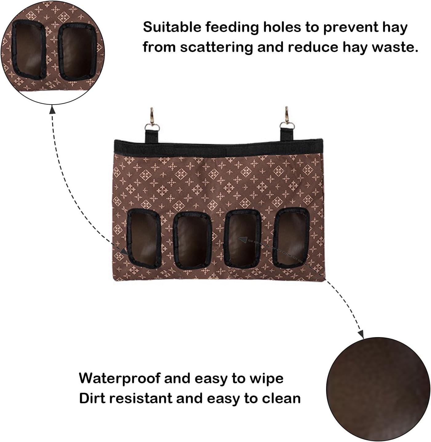 Made from durable 600D Oxford cloth and reinforced hole edges, this rabbit hay feeder bag guarantees long-lasting use.