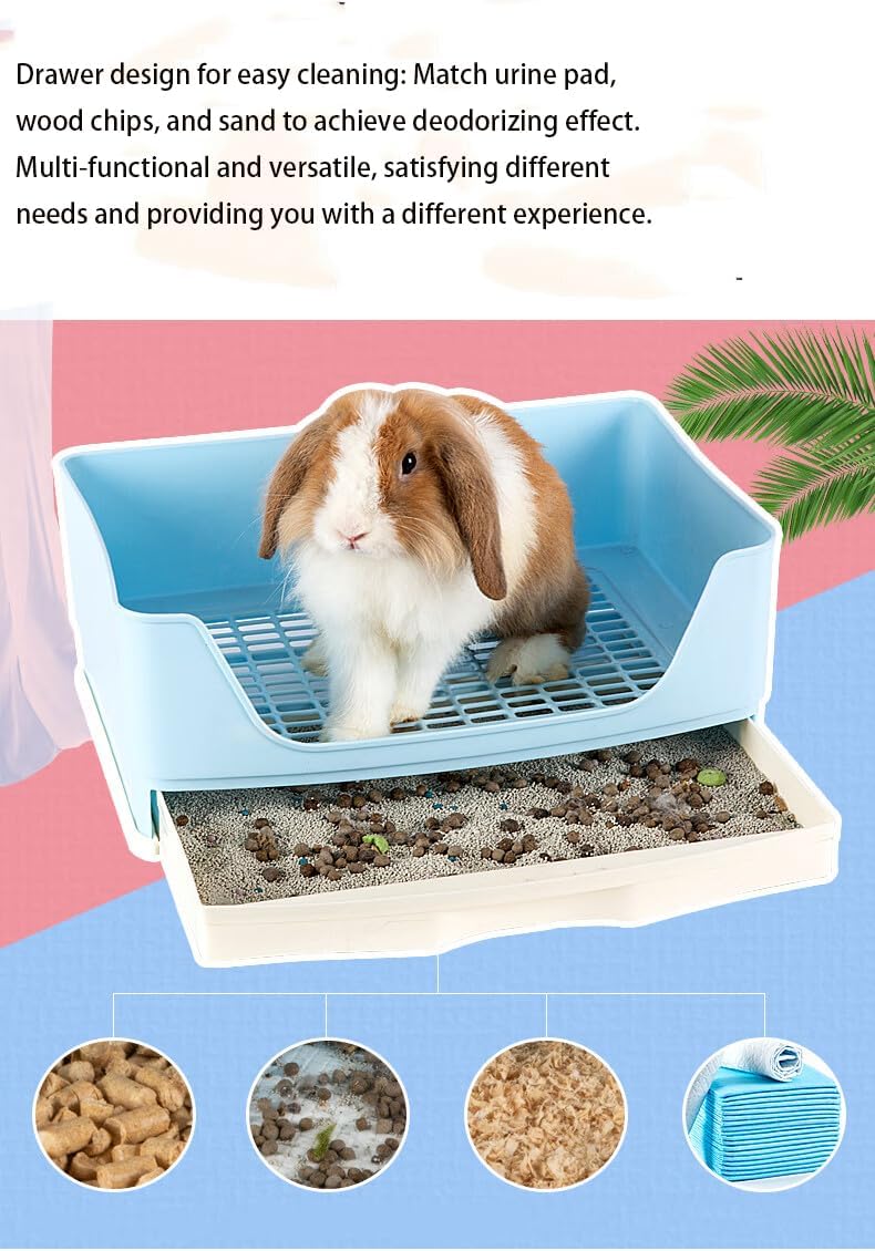 Spacious rabbit litter box designed for small pets like rabbits, ferrets, and guinea pigs, with a large space, easy cleaning, and urine splash prevention.
