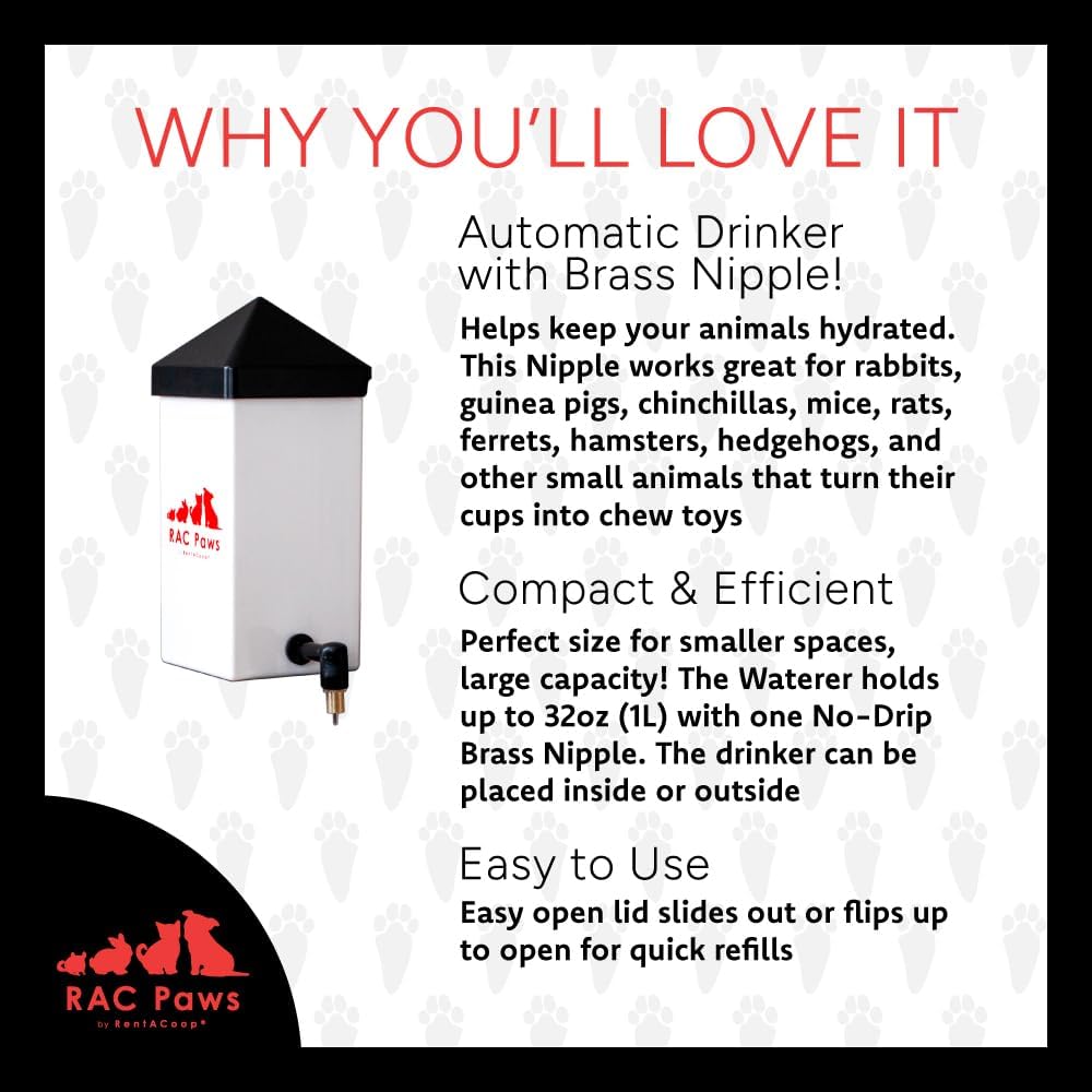 Compact and Efficient: Perfect size for smaller spaces, large capacity! The Waterer holds up to 32oz(1L) with one No-Drip Brass Nozzle. Suitable for small animals such as rabbits, guinea pigs, chinchillas, ferrets, hamsters, hedgehogs, rats, mice and more