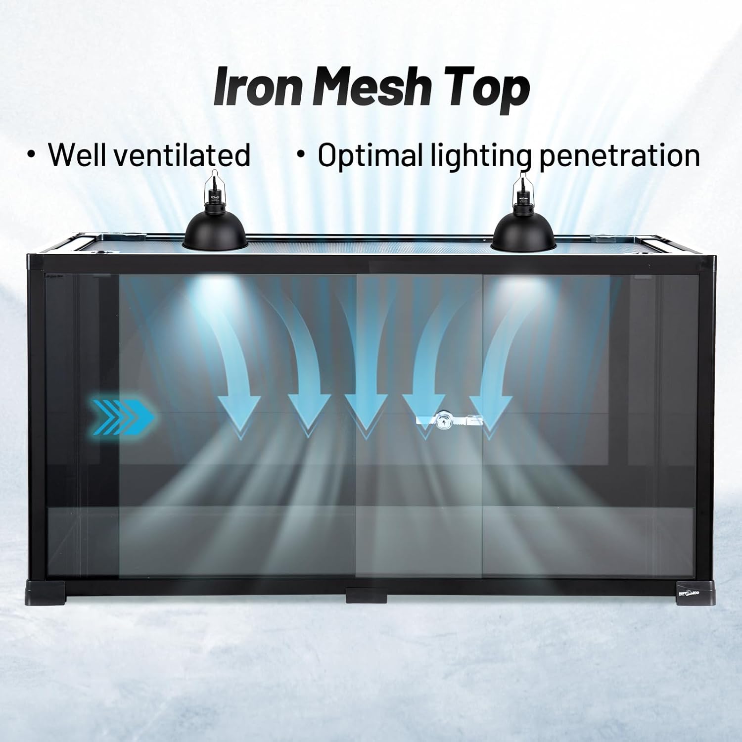 【GOOD VENTILATION AND UVB/HEAT IRRADIATION】Screen top provides ventilation and allows uvb and infrared penetration. Front sliding doors can open easily to feed your pet and prevent escape with the secure lock.