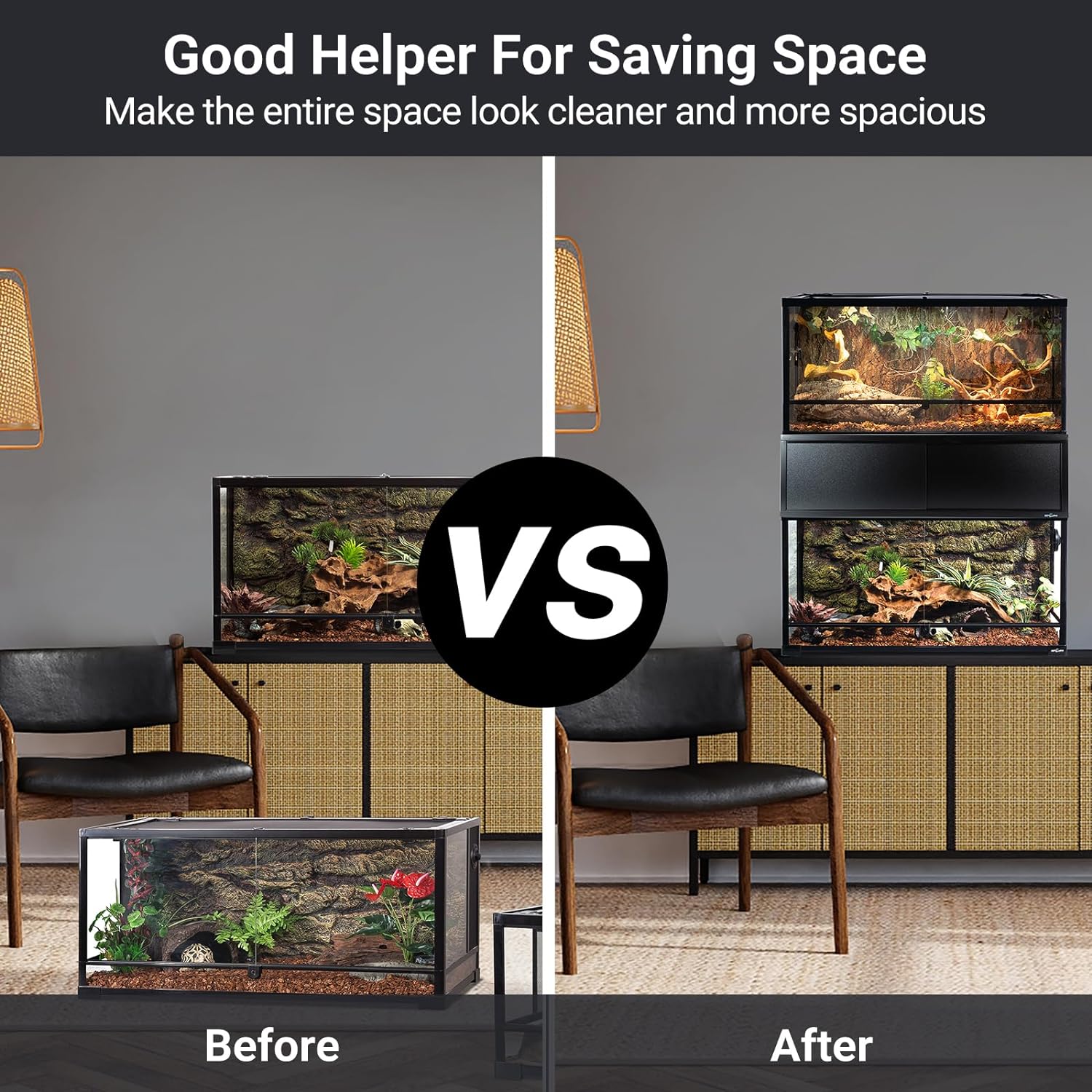 【Space Saving】: Being able to stack our tanks without sacrificing pet comfort, saving a lot of home/office space! Perfect for animal enthusiasts in small spaces and reptile families!