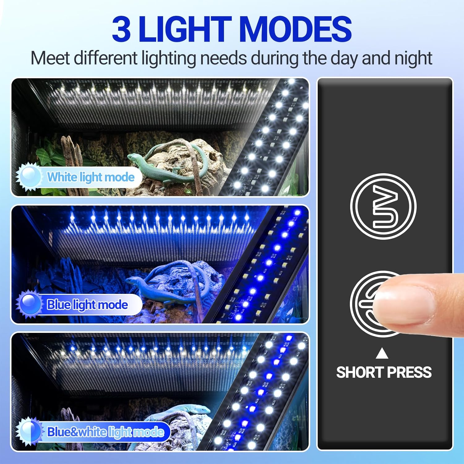 【3 Customizable Light Modes + Dimming Control】: Switch seamlessly between blue, white, or blue-white combo modes to simulate dawn, daylight, and dusk cycles. The UVB LED reptile light supports brightness adjustment, catering to Ferguson Zones 1-4 habitats. Perfect for tailoring environments for heat-sensitive species like geckos or tropical lizards.