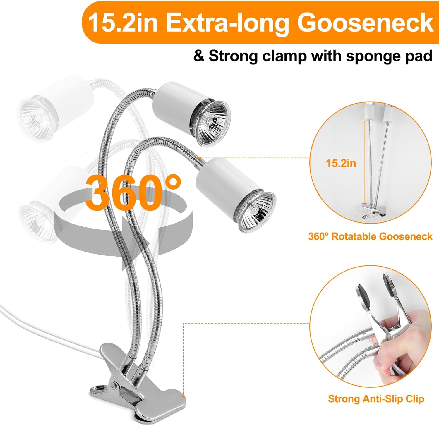 The double-head design can cover a wider area and can provide more simulated sunlight.Intelligent cycle timer Longer gooseneck designAdjustable brightnessPremium ceramic lamp holders 4 Bulbs included