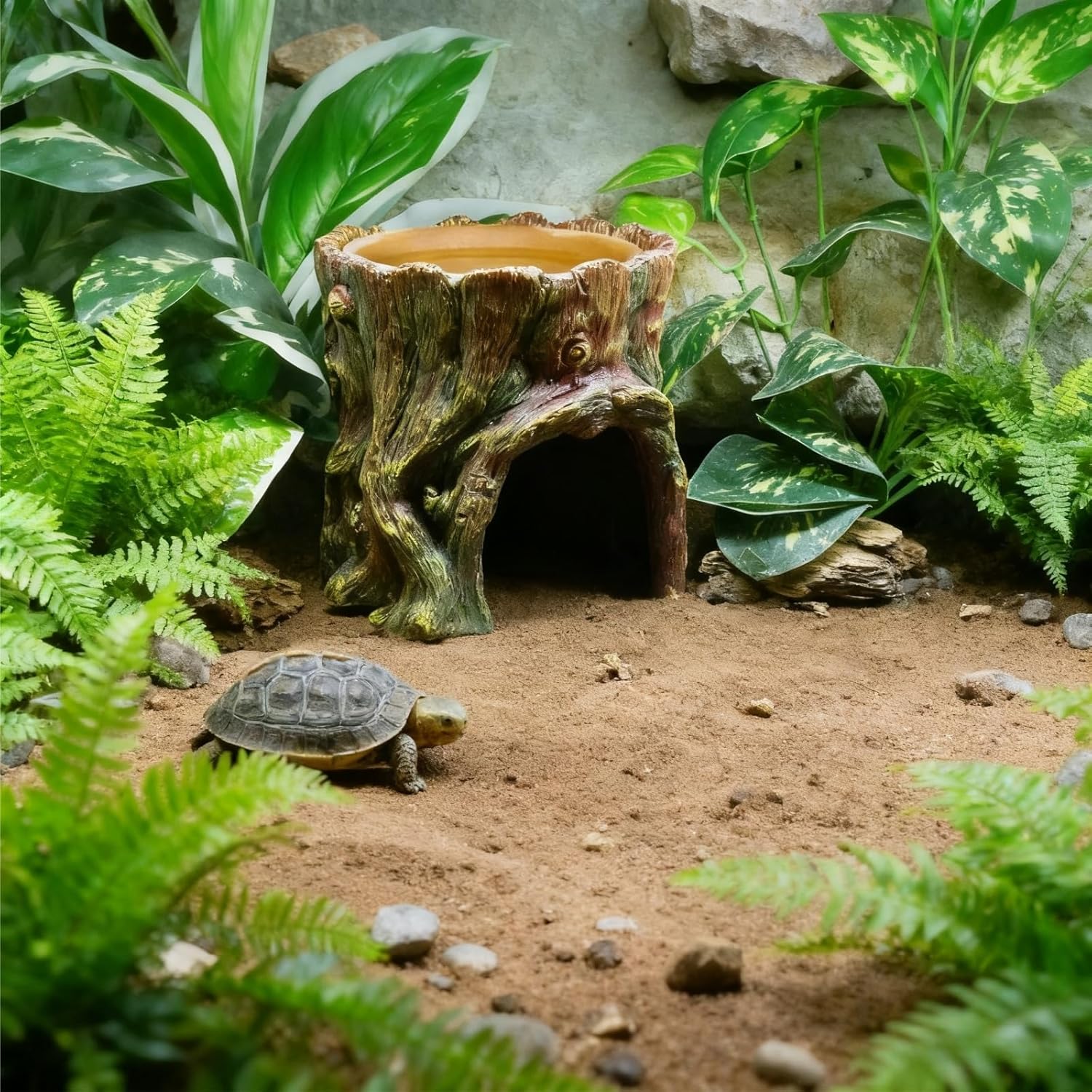 PRACTICAL USE: The snake hide is ideal for climbing and hiding, and adding water to the bowl helps maintain proper humidity levels in the reptile’s habitat, please kindly note the reptile habitat hideouts height is 5.7 inch, the item width is 5.3 inch, the tortoise hide door width is 2.56 inch