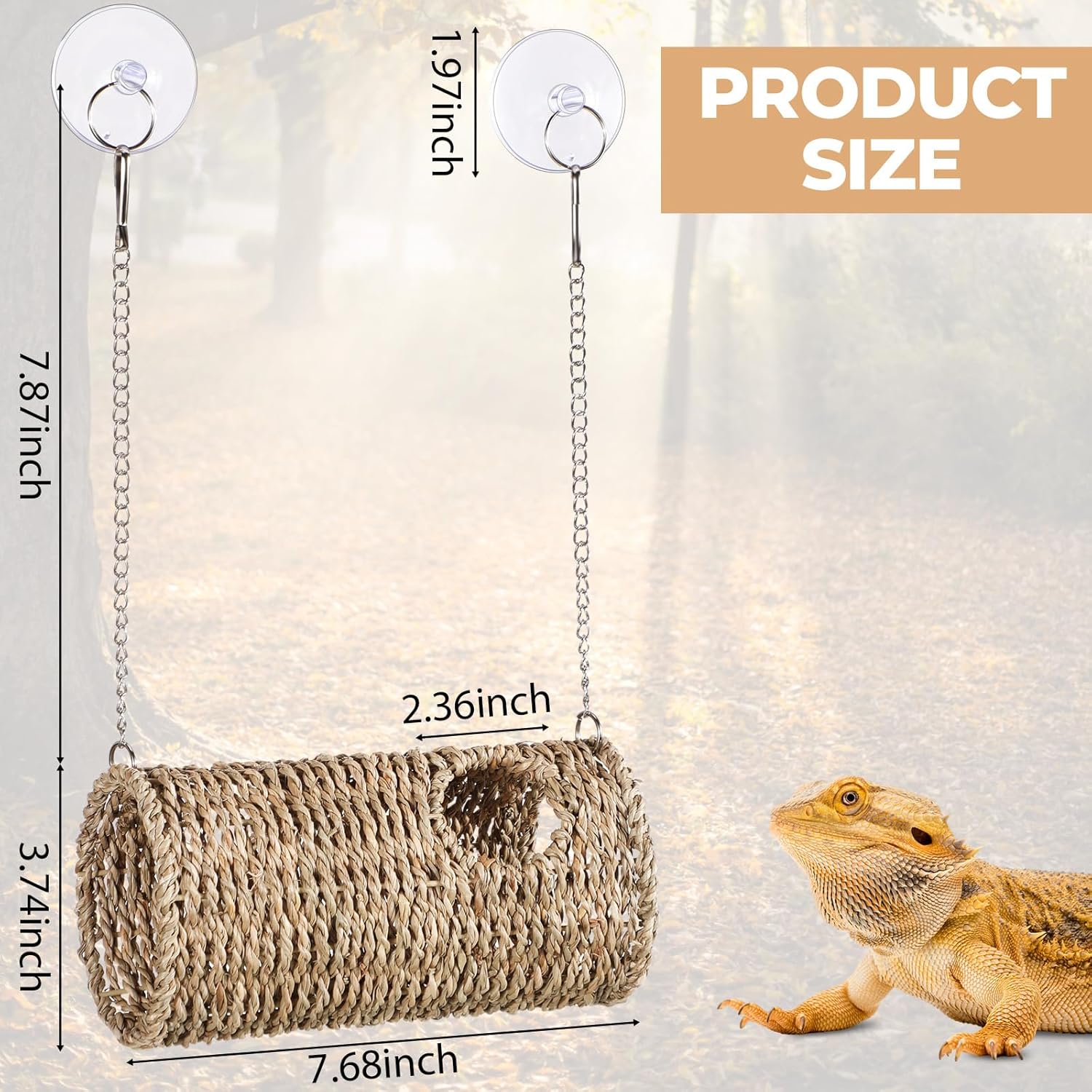 Size Detail: the reptile tank decor is 7.68″ long with a diameter of 3.74″, featuring two 2.36″ diameter holes, while the chains are 7.87″ long, and the suction cups are 1.97″ in diameter; Size variations are possible since it is handcrafted from straw