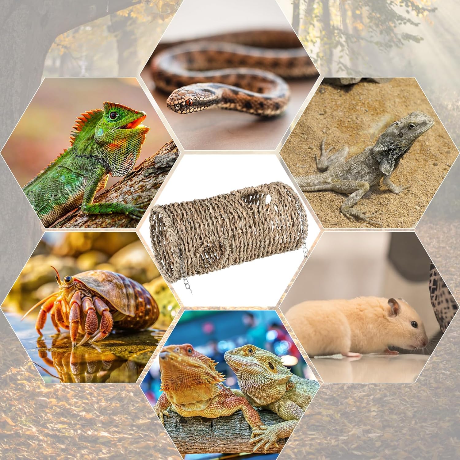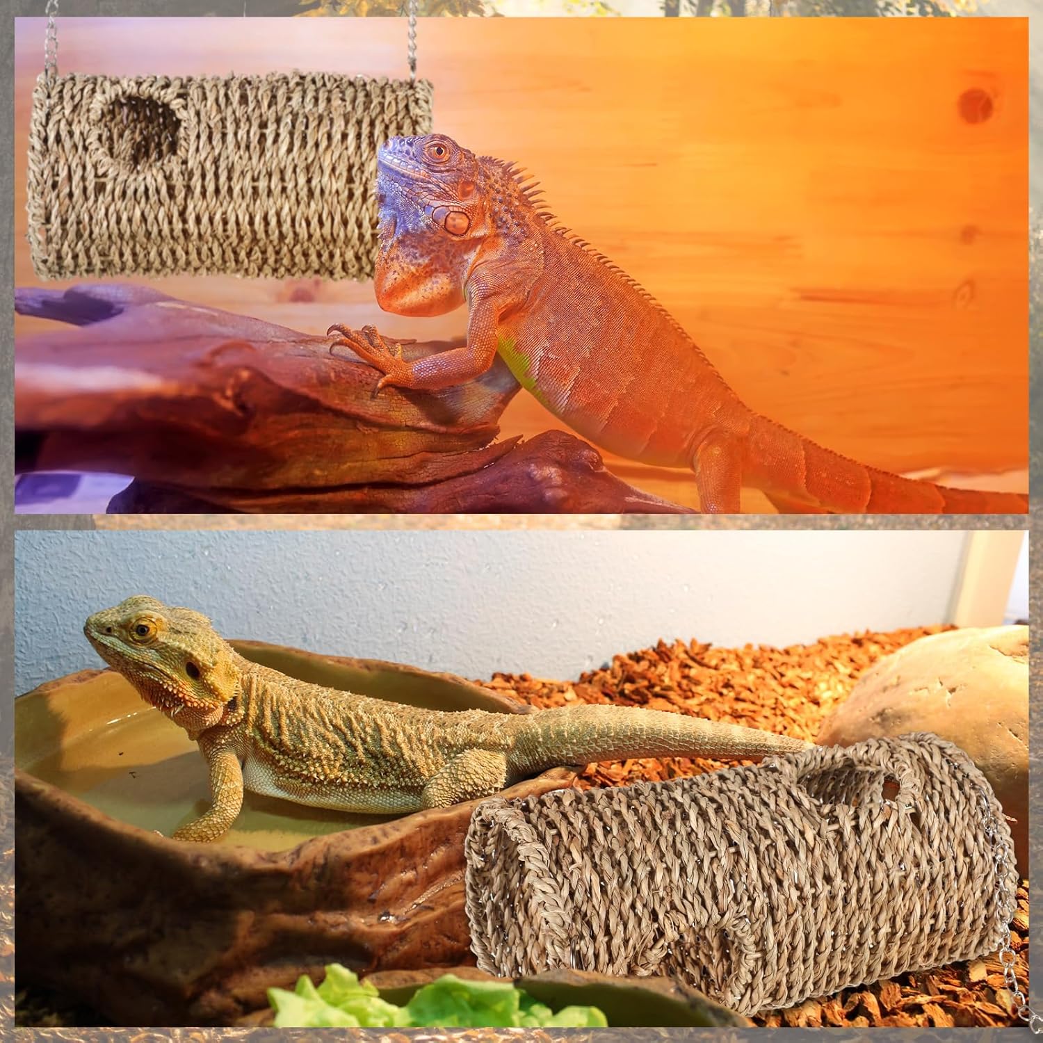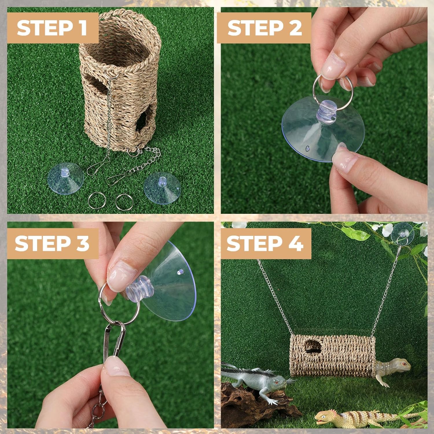 Material: the reptile hide cave is made of straw, ensuring a natural and safe space; The plastic suction cups and metal chains can secure the cave onto glass or acrylic surfaces; You can modify the cave’s setup to suit your pet’s habit and comfort