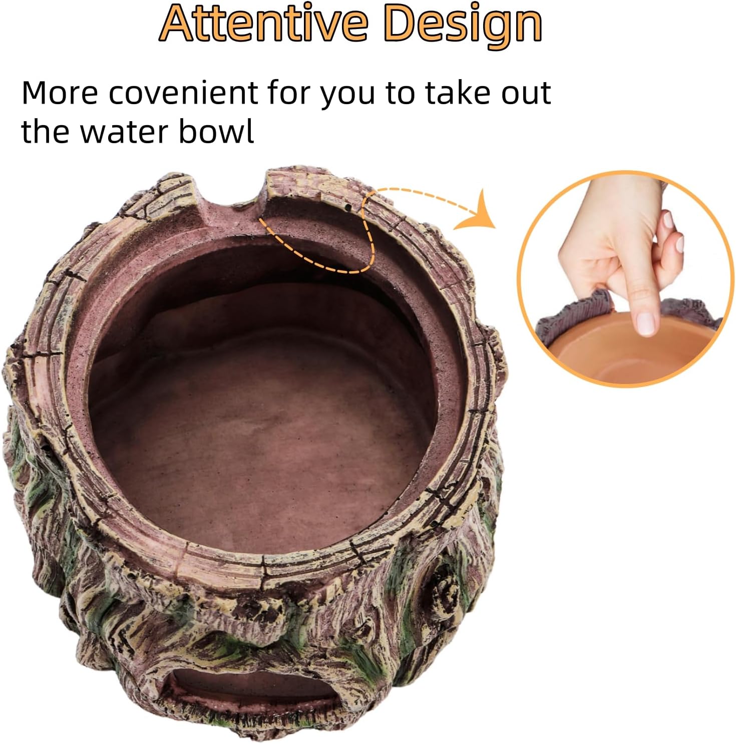 3 in 1 Reptile Humid Hideout: Measures 5.5″D × 4″H. You can add water in terracotta dish to effectively increase the humidity of the reptile home, and resin base also can be used as food dish. Both are detachable, meeting the various usage needs of small reptiles.