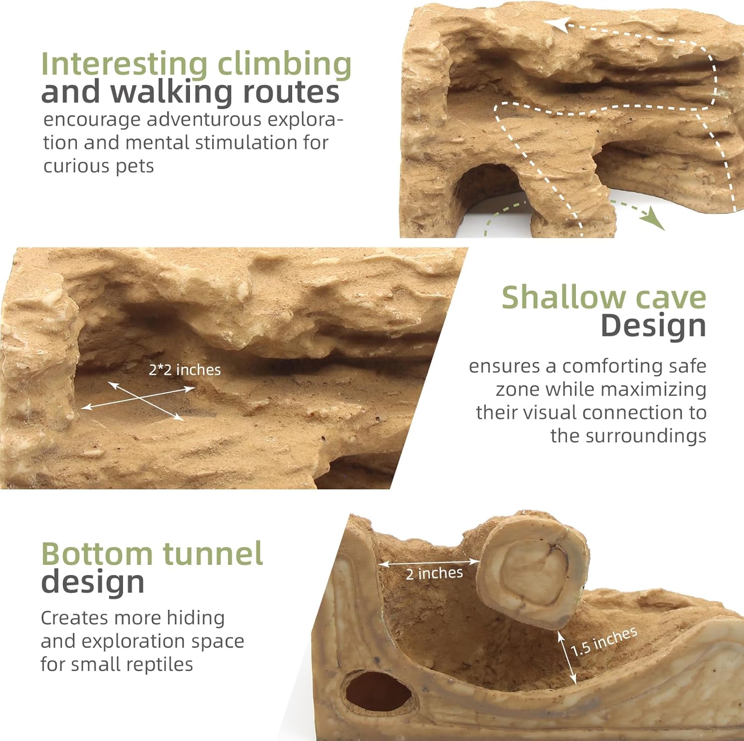 [Realistic Rock Formation] :The Rock Formation Cave are naturalistic decors Designed, The cave entrances to be used not only as a dark Den for your reptile but also as a humid hideaway, your lovely pet betta pleco or other smaller fish would be super happy to go in and out of the trunk cave to sleep, rest, hide, play, breed. Reptiles can traverse caves, climb. Can be combined with other ornamentsReptile can climb on the platform to enjoy sun bathing, resting, playing