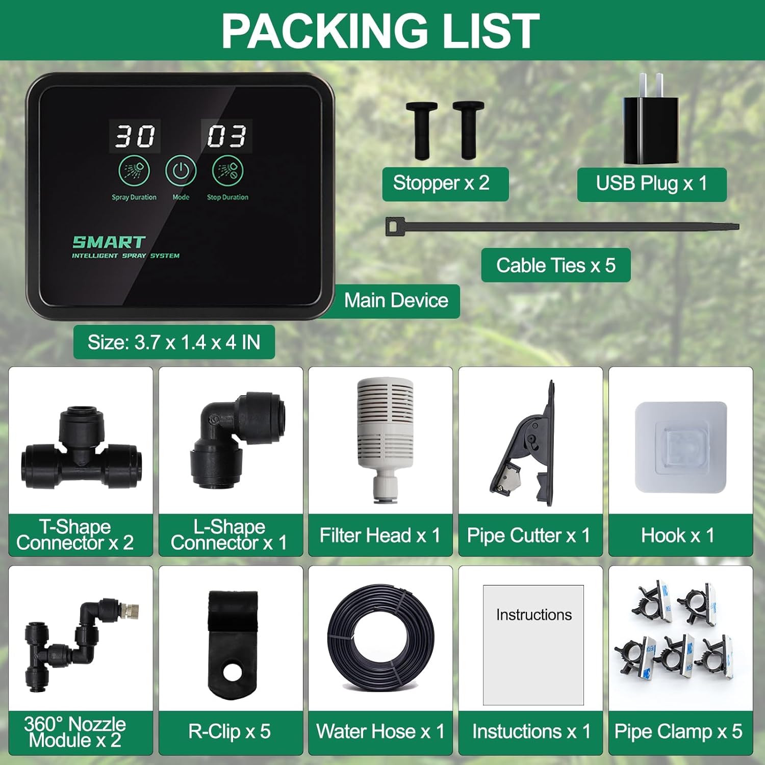 360° ROTATING NOZZLES: Reptile humidifier misting system with 2 adjustable nozzles. Support 360° rotating, can be disassembled and adjusted according to the size of different reptile terrariums. By adjusting the length of the water hose and the angle of the nozzle, you can cover any location you want to spray, so that the tropical rainforest terrarium can get sufficient moisture.