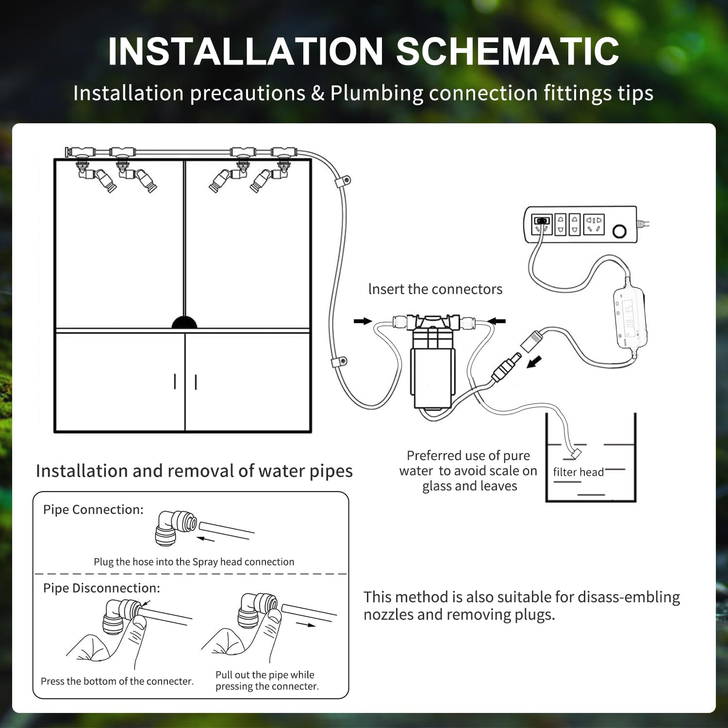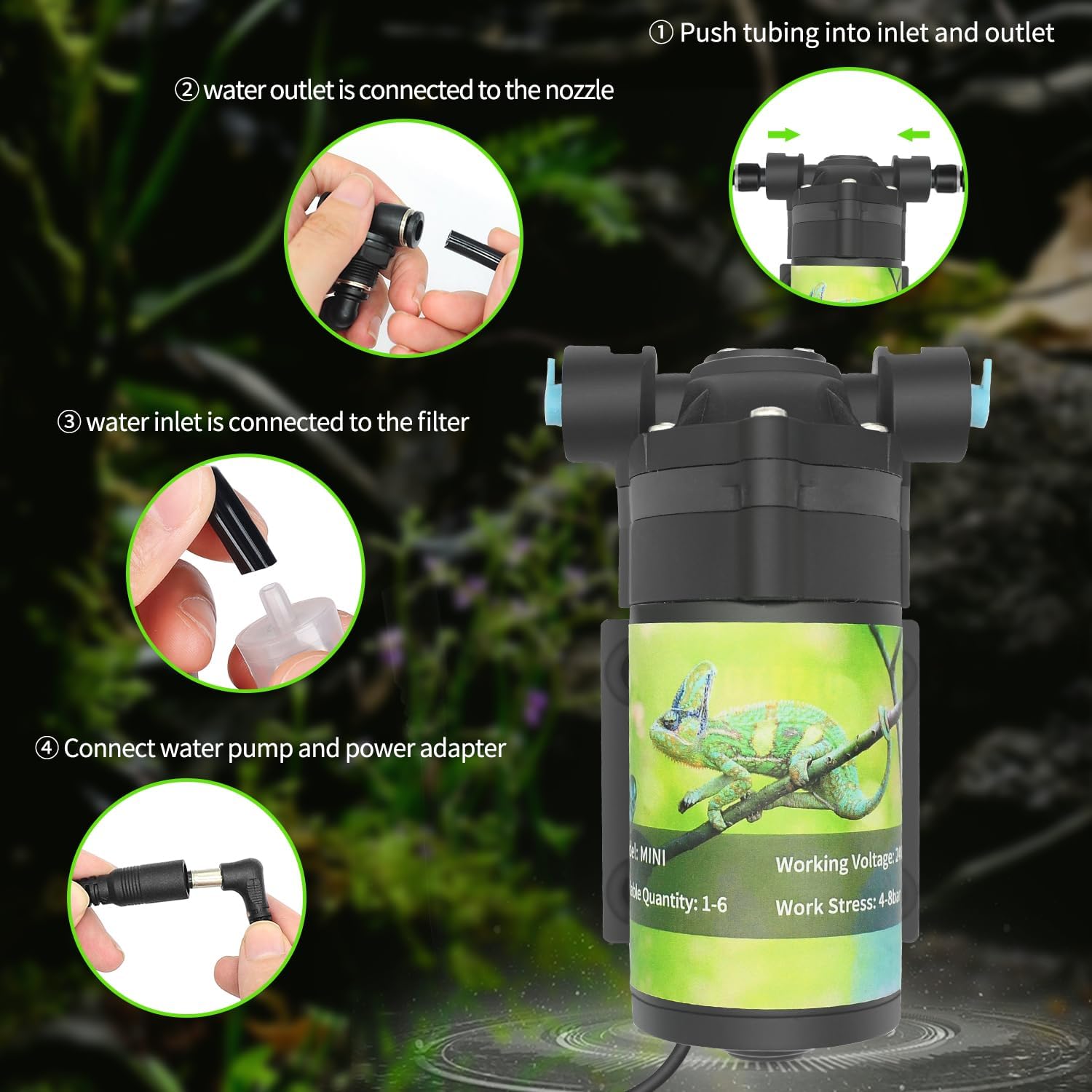 By rotating the nozzle to adjust the Angle and direction of the spray, all directions to meet the reptile aquarium filled with water.Powerful, can connect up to 10 nozzles.