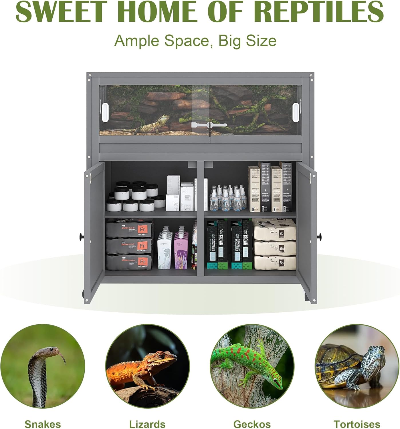 Ample Storage Space:The reptile tank with stand and storage cabinet with adjustable shelves.The storage capacity lets you store reptile supplies neatly.The storage area fits well with the main enclosure, ensuring a functional design.The 30 gallon reptile tanks fit for snakes,lizards,geckos,bearded dragons.