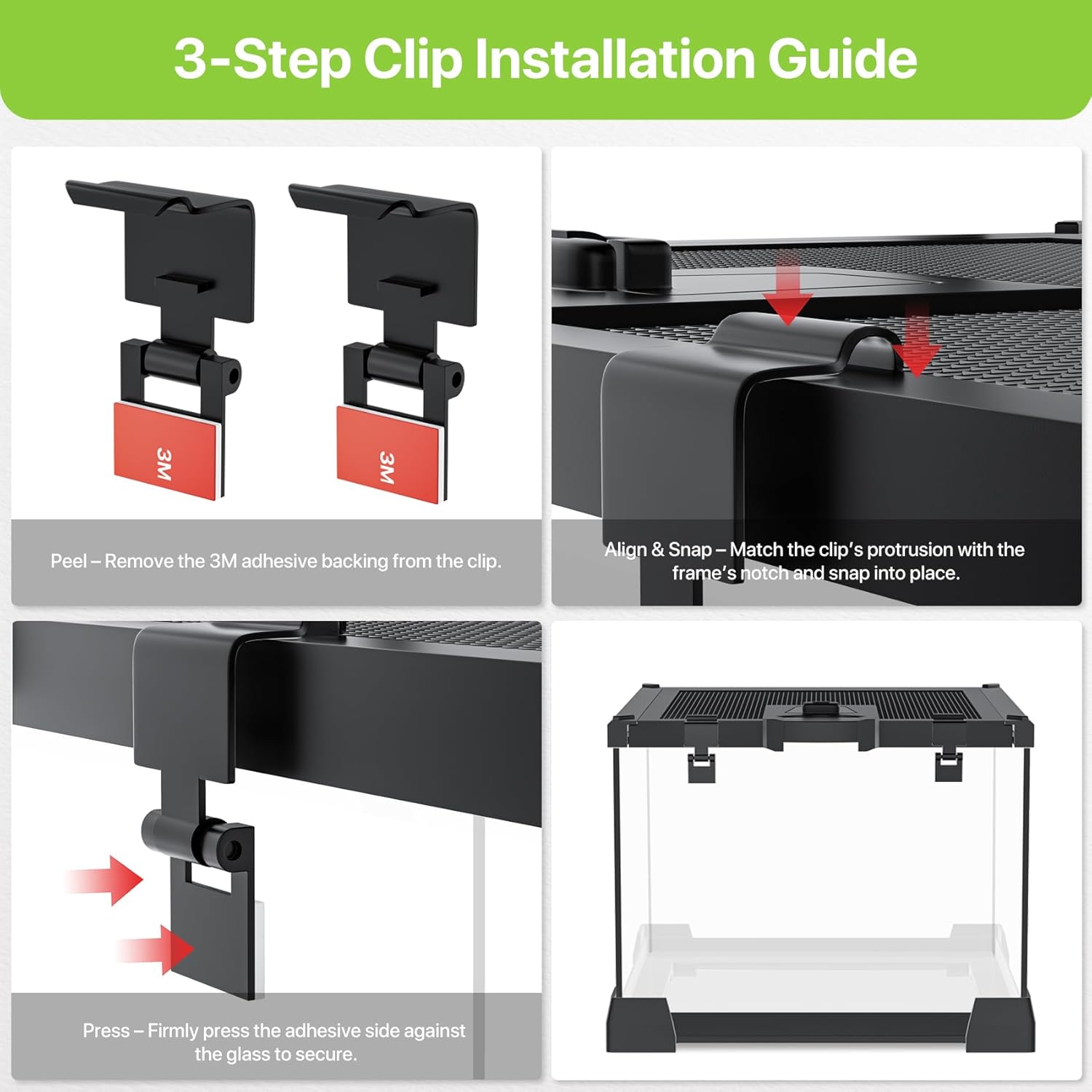 Top-Opening Mesh Lid with Latch — Easy feeding & cleaning from above; secure latch keeps pets safe. Fine mesh ensures ventilation and is compatible with dome-style UVA, UVB, and heat lamps (not included).