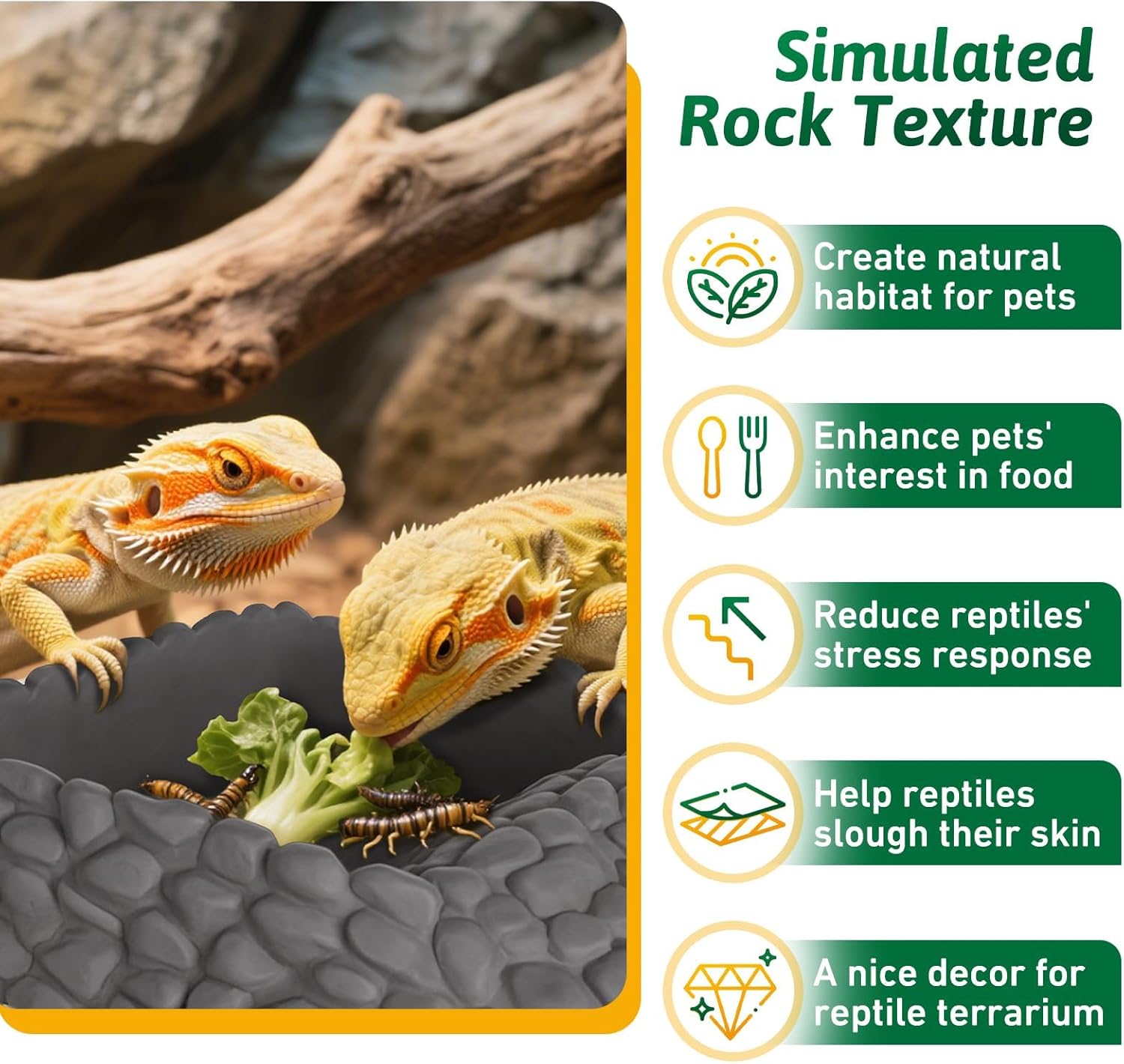 Simulated Rock Texture. The snake water bowl mimics the texture and shape of rock, to make it easier to integrate with the natural environment. The rock food bowl can create a natural habitat for reptiles, reducing their stress response, enhancing their interest in food and feeding in peace. A perfect natural terrarium decor used for bearded dragon tank accessories. In addition, the natural texture of the feeder can help your pets slough their skin to grow, and also serve as a ladder.