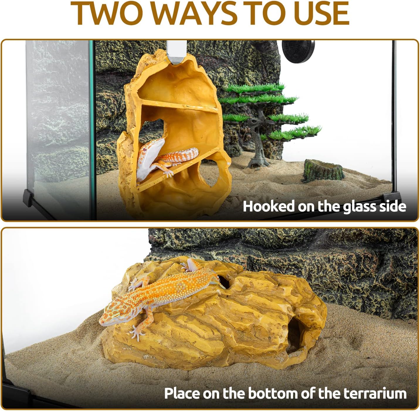 Dual-use Reptile Hide: This reptile hideout has two ways to use: put at the bottom of terrarium as multi-levels reptile hide, or use hook to fix on the glass tank side. Perfect climbing toy and hiding cave for reptile