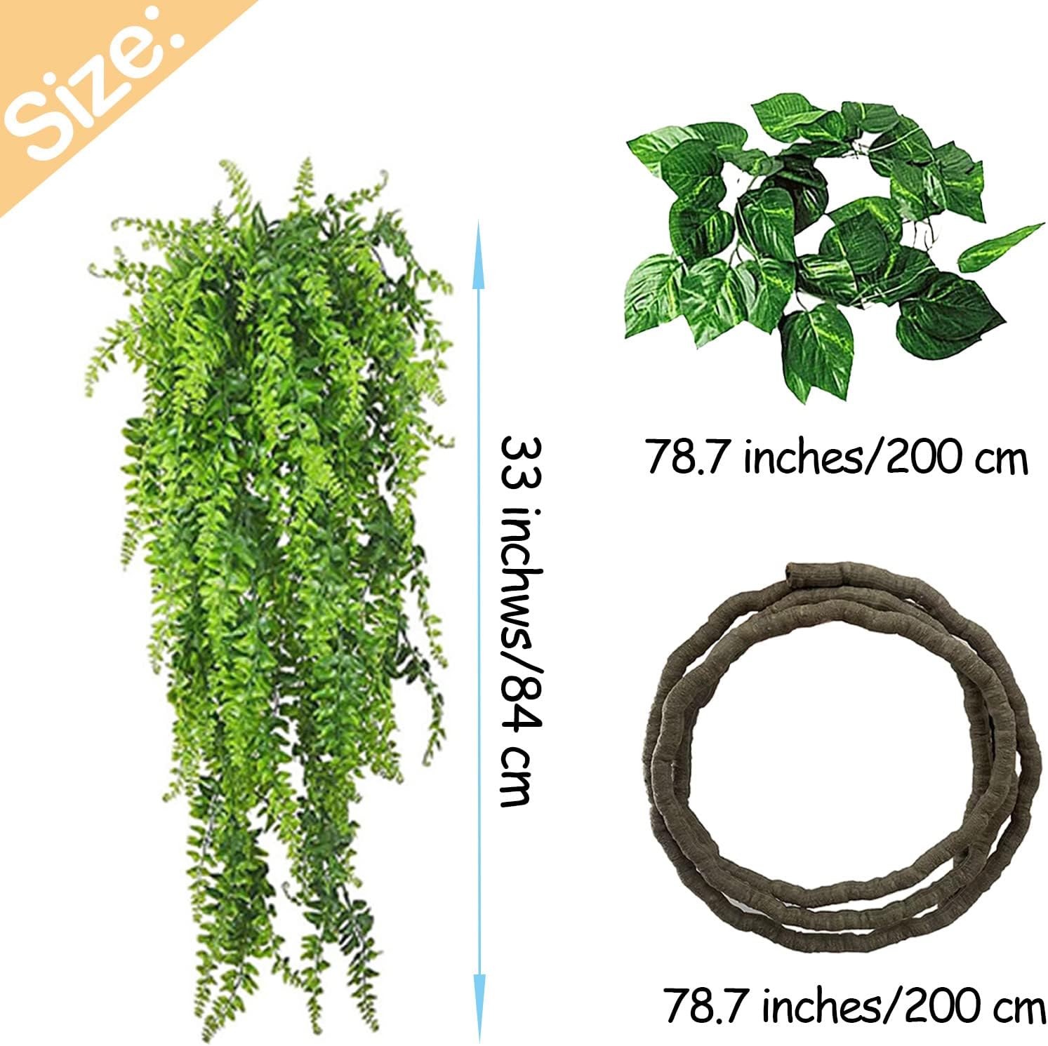 Reptile Decor Size:Crested gecko climb driftwood 11.81×5.9×8.85 in,hanging vines plant 33.46 in,reptile plant leaves 78.74 in,1x suction cup.Reptile branches for climbing also provide a place to play,or a place for fish to breed,play,forage