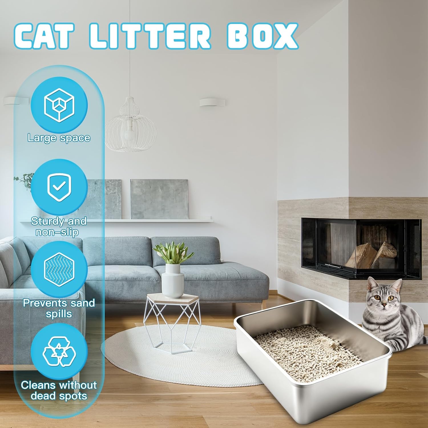 【2-Pack Complete Set】Each order includes TWO stainless steel litter boxes, plus 2 non-slip mats (30x40cm), 2 plastic scoops, and 2 rolls of waste bags. Perfect for multi-pet homes or easy rotation.