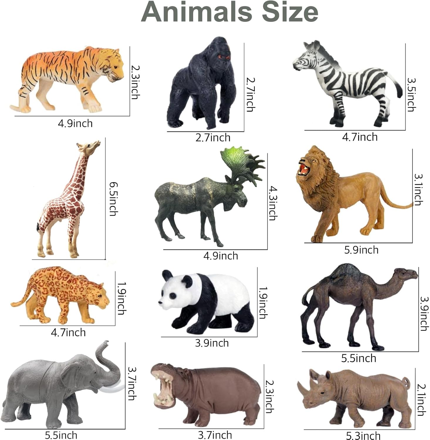 12 Large Safari Animals Figures: 12 Pcs unique non-repeating plastic jungle animals figurines, Including tiger, lion, gorilla, elephant, panda, giraffe, cheetah, rhinoceros, camel, moose, hippo, zebra. Measure about 4 to 6.3 inch in length, Perfect size for kid’s hands, Fun and educational for both boys and girls