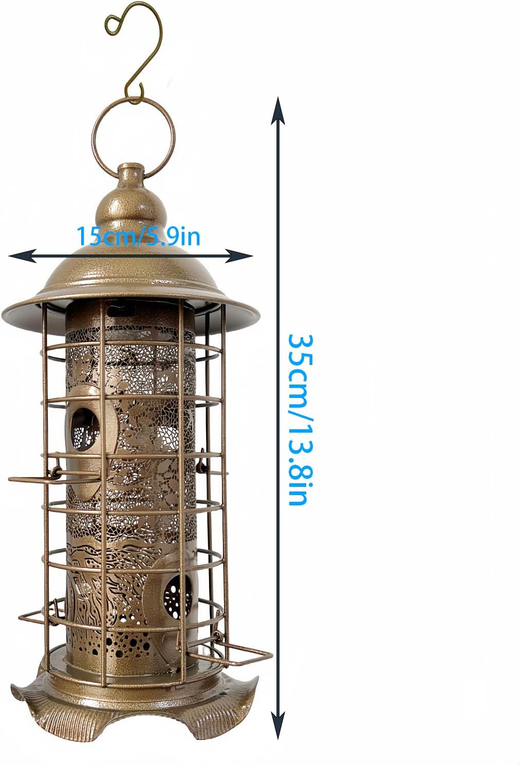 Decorative Lantern Design: Enhance your garden, patio, or backyard with this elegant lantern-style bird feeder. The intricate metalwork and classic bronze finish add a touch of vintage charm and sophistication, making it both a functional feeder and a beautiful outdoor decor piece
