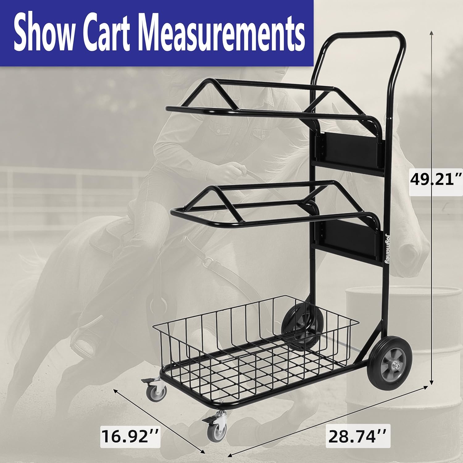 Saddle Rack Cart with Wheels – Heavy-Duty Horse Tack Storage Organizer with 2 Locking Casters, 2-Tier Saddle Stand, Hooks & Bottom Basket – Portable Rust-Resistant Steel Saddle Holder